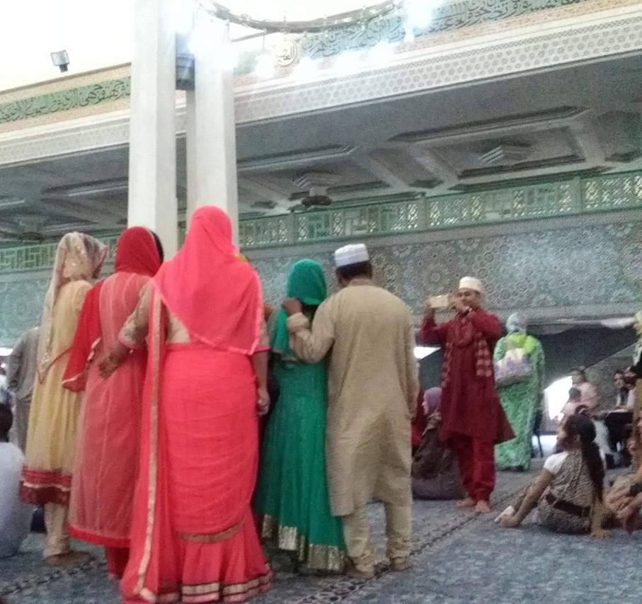 La Grande Moschea è un edificio maestoso ricoperto di travertino e che spicca anche nell’ampio cortile circondante sotto il caldo sole estivo. Numerose donne con loro costumi nazionali ravvivano la folla, si nota una sola di loro indossare il Jilbab, il lungo abito nero che copre tutto il corpo, altre con abiti sgargianti e lustrini e paillettes. Oltrepassando il cancello, per tutte le donne arriva il momento di coprirsi il capo, senza eccezioni. I fedeli si fermano all’ombra dei pini e delle palme.