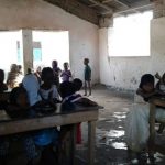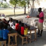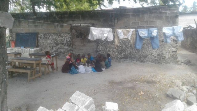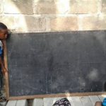 Quello che manca è la scuola stessa. I banchi sono portati sul prato dagli studenti alle sette e posizionati vicino al muro di una casa diroccata, poi riportati dentro a fine lezione alle dodici. Un blocco nero si muove con otto piccoli piedi: è la lavagna che viene appoggiata su dei mattoni mentre un bambino si arrampica per scrivere la data. Intorno i kuku, i polli, i rifiuti, i passanti e i vicini di casa che preparano la colazione e aiutano le maestre nelle situazioni di panico: tutto il villaggio partecipa alle lezioni a modo suo.
