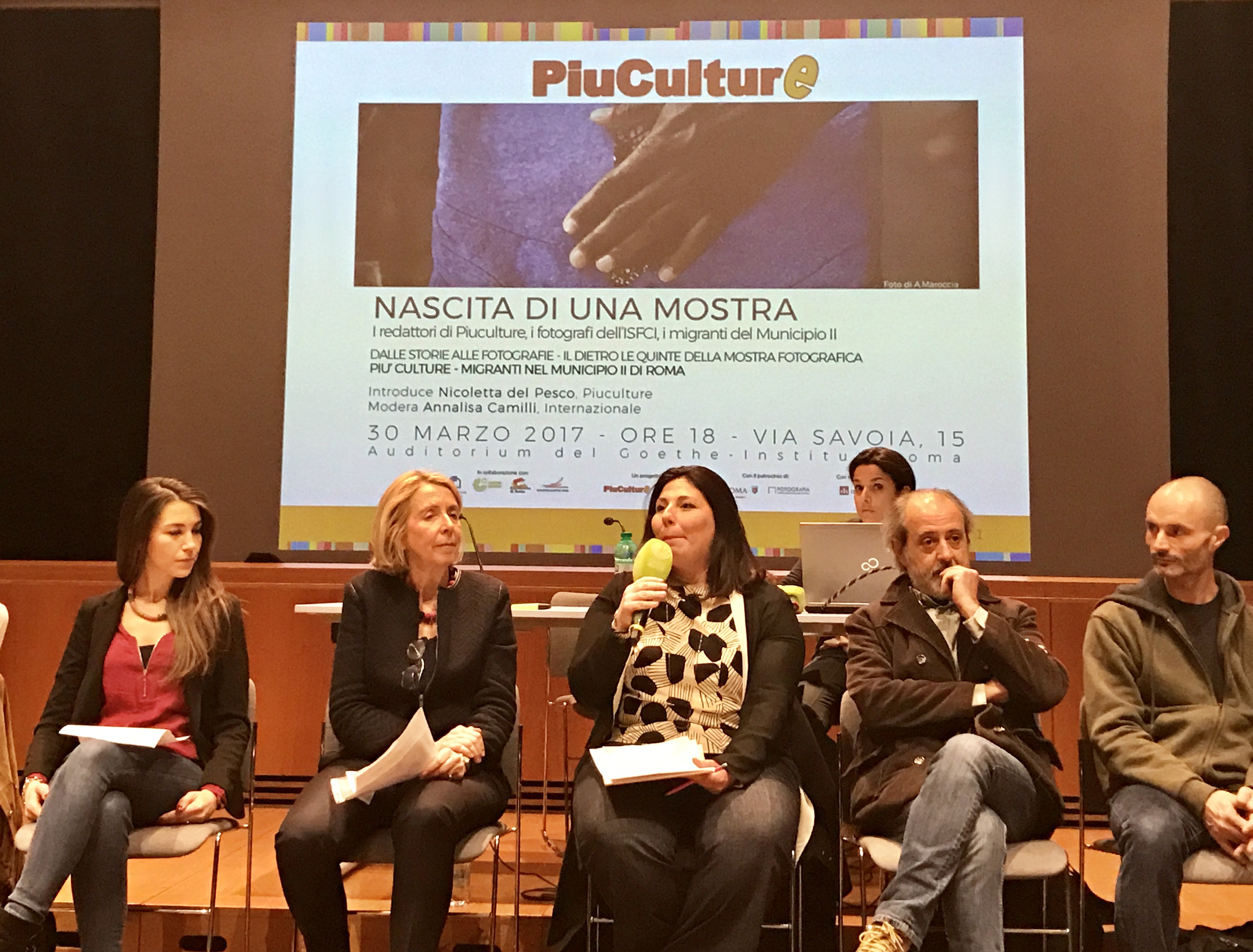 Giovedì 30 marzo nella sala dell’Auditorium del Goethe Institut, Nicoletta del Pesco, direttrice di Piuculture, apre con questi dati l’evento “Nascita di una mostra”, che ha dato volto e voce alle storie dei migranti del Municipio II, raccontate dai redattori di Piuculture in sinergia con i fotografi dell’ISFCI.