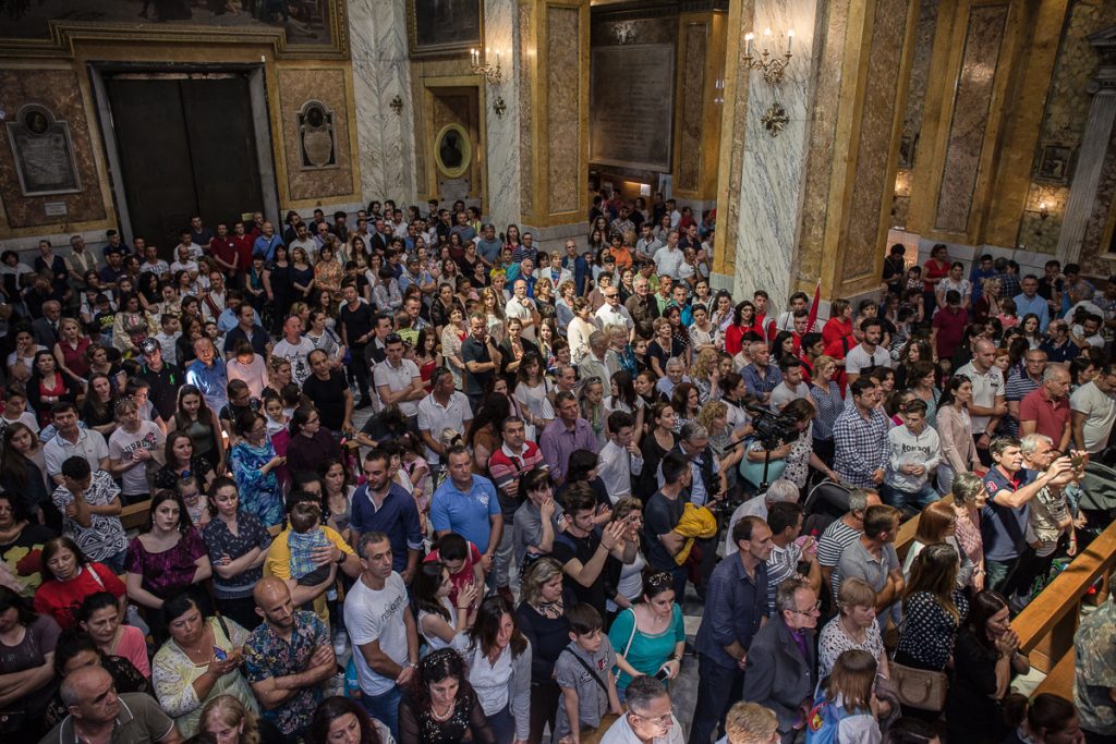 Nel frattempo la messa prosegue, qualcuno è rimasto in piedi, una schiera di ragazzi appoggiati agli altari laterali indossano delle magliette rosse con delle aquile nere, simbolo dell’Albania: “Siamo 50 ragazzi, dai 15 ai 19 anni, della casa famiglia Gruppo Volontari Accoglienza Immigrati di Lucca. È la prima volta che partecipiamo, ci hanno detto che dopo c’è un pic-nic, speriamo di divertirci”, dice Robert.