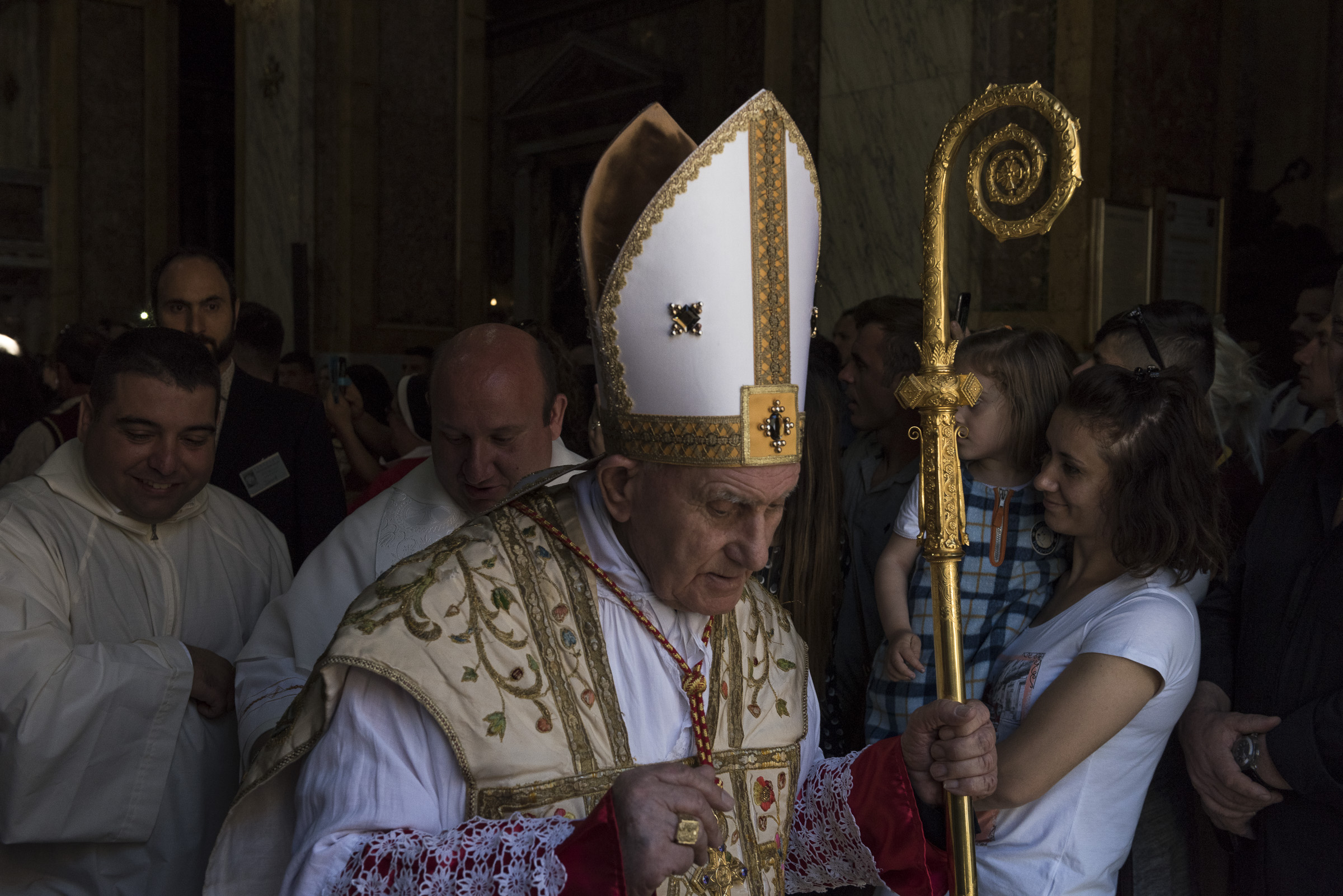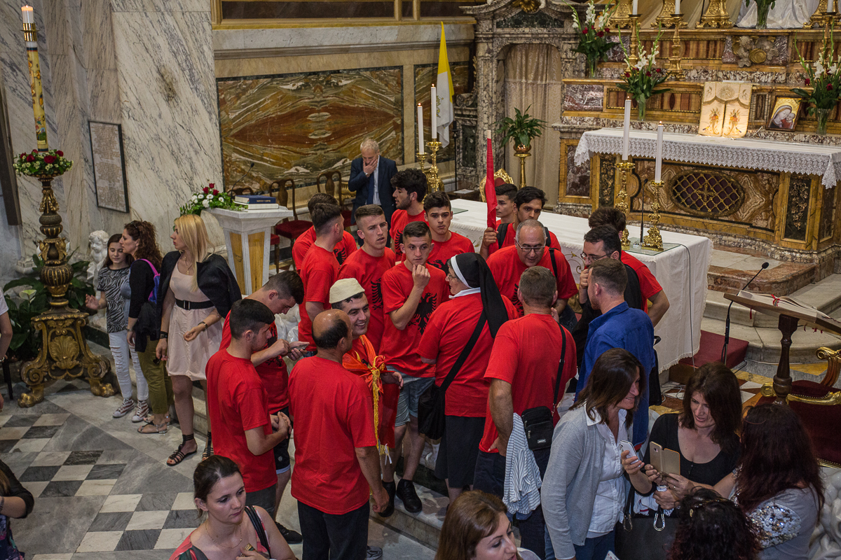 Nel frattempo la messa prosegue, qualcuno è rimasto in piedi, una schiera di ragazzi appoggiati agli altari laterali indossano delle magliette rosse con delle aquile nere, simbolo dell’Albania: “Siamo 50 ragazzi, dai 15 ai 19 anni, della casa famiglia Gruppo Volontari Accoglienza Immigrati di Lucca. È la prima volta che partecipiamo, ci hanno detto che dopo c’è un pic-nic, speriamo di divertirci”, dice Robert.