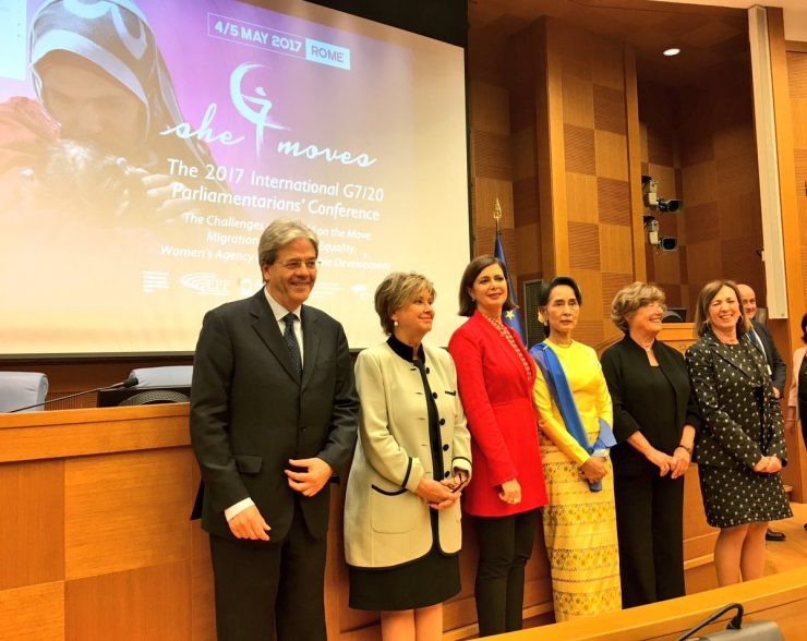 She Moves – Le sfide di un mondo in movimento: migrazione, uguaglianza di genere, ruolo della donna e sviluppo sostenibile“She moves – Le sfide di un mondo in movimento: migrazione, uguaglianza di genere, ruolo della donna e sviluppo sostenibile” è il titolo della Conferenza Internazionale dei Parlamentari che si è svolta a Roma il 4 e il 5 maggio. “L’intento della Conferenza è di sensibilizzare i Governi G7 e G20 e influenzare la loro agenda con impegni in favore della parità di genere, della salute, dei diritti sessuali e riproduttivi di donne e ragazze nel quadro degli obiettivi di sviluppo sostenibile” ha esordito Pia Locatelli coordinatrice del Gruppo Parlamentare”Salute globale e diritti delle donne” fra gli organizzatori dell’incontro.L’impegno, alla fine dell’approfondito dibattito dei quasi 100 partecipanti, è stato quello di stilare un appello, che è stato consegnato alla sottosegretario Maria Elena Boschi perché lo trasmetta alla direzione del G7 a Taormina il 26 e 27 maggio prossimi. Il documento volto a evidenziare l’attenzione diversa da riservare alle donne migranti, un’attenzione di genere, nell’accoglienza e nello sviluppo delle politiche di integrazione, cogliendo nelle donne un elemento indispensabile e facilitatore delle politiche di integrazione sia nel paese di origine che in Europa.Laura Boldrini, presidente della Camera, ha evidenziato come difronte ai massici spostamenti della popolazione verso l’Europa la politica si divida tra coloro che cavalcano l’angoscia disorientando i cittadini e chi cerca di dare risposte, difficili da trovare, ad un fenomeno che va governato e gestito in maniera umana. Il movimento delle persone è inarrestabile spinto da diseguaglianza, povertà, conflitti. “Dal 2012, quando lavoravo per UNHCR i rifugiati sono raddoppiati e oggi sono 65milioni. Nello specifico del nostro paese “l’arrivo delle donne nigeriane è aumentato in maniera esponenziale, ricordo i loro visi quando sbarcavano, avevano sguardi spenti, viaggiavano con sedicenti parenti, e il 70%, per l’OIM, erano vittime di tratta. Dobbiamo contrastare e prevenire questo problema, l’Italia ha una buona legislazione in termini di tratta ma spesso mancano le risorse per attuarla”. Dati confermati da Carlotta Santarossa dell’OIM, un numero quello delle donne nigeriane in arrivo che si è incrementato in maniera esponenziale passando da 1500 a 11mila nel 2016. “La parte più sfidante del nostro impegno è far capire che sono vittime di un crimine, manipolate e spaventate. La prevenzione dovrebbe essere fatta non solo nel paese di origine, ma anche in quello di arrivo”. L’affermazione She moves, simbolo di questo incontro, dovrebbe includere: libere e consapevoli” dal pubblico arriva un applauso scroscianteIl Presidente del Consiglio Paolo Gentiloni ha sottolineato che “l’obiettivo a breve riguardo le migrazioni è ridurre i flussi irregolari per sostituirli con quelli regolari, togliendo ai trafficanti l’esclusiva degli accessi. Mentre nel lungo periodo l’alternativa è sostenere lo sviluppo e la crescita nei paesi d’origine così da ridurre i flussi migratori”. L’impegno per i diritti della donna è una priorità in politica estera: l’Italia con altri paesi nelle Nazioni Unite si è battuta contro le mutilazioni femminili, i matrimoni forzati, il tutto realizzando politiche di cooperazione allo sviluppo anche con l’intento di ridurre le diseguaglianze di genere, “l’obiettivo è mettere in campo una road map e condividerla, ne ho già parlato a Ottawa con il leader canadese, al quale passeremo il testimone della presidenza del G7 “ ha concluso Gentiloni.Ospite d’eccezione il Premio Nobel per la Pace e attualmente Consigliere di Stato del Myanmar Aung San Suu Kyi che ha evidenziato come il suo paese, abbia una grande esperienza di migraziani originate da problemi di natura diversa: economici e legati a conflitti politici. “Il Myanmar non è ricco e sta cominciando ad acquisire cognizione di sé dopo la dittatura. La riconciliazione nazionale è difficile: dobbiamo partire spiegando cosa significhi democrazia e come le persone insieme possano fare meglio di una persona da sola. Analogamente è importante far capire che la legge non serve a punire, ma per creare armonia e sicurezza nella società. L’educazione ha un ruolo cruciale, consente di evidenziare i problemi e avere l’abilità per risolverli. Molti sono stati costretti a migrare, 3 milioni nel nostro paese: nessuno lascia volentieri la propria casa, ma spesso non c’è scelta. Le soluzioni per i problemi di genere e per le migrazioni sono diverse da un paese all’altro, ma queste difficoltà si potrebbero ridurre se si istaurasse una collaborazione tra i paesi di partenza e quelli ospitanti”.Le due giornate di lavoro sono state organizzate dal Gruppo di lavoro parlamentare “Salute Globale e Diritti delle Donne”, dal Forum Parlamentare Europeo su Popolazione e Sviluppo, e dall’AIDOS con il patrocinio della Camera dei Deputati e del Senato ed con collaborazione con la Presidenza Italiana del G7.