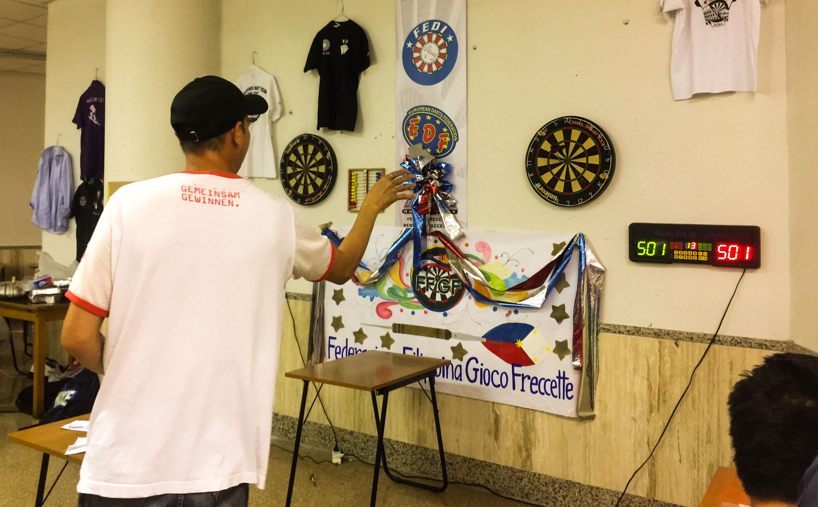 Pensiero condiviso anche da Dante, giovane domestico proveniente da Manila fondatore della Federazione Filippina di Freccette. “Sono tesserato da diversi anni alla FIGF (Federazione Italiana Gioco Freccette ) ma ho deciso di creare quella filippina quattro anni fa perché purtroppo non tutti possono permettersi di tesserarsi a quella italiana. Siamo quasi una cinquantina di soci.” Infatti, la Festa delle Filippine è anche un buon motivo per giocare a uno degli sport più praticati nel paese. “Purtroppo l’elevato costo per festeggiare l’indipendenza delle Filippine a Piazzale Ankara e le lamentele ricevute dai vicini del quartiere per l’immondizia che si creava a fine giornata, hanno fatto si che l’evento sia stato spostato qui. Noi però preferivamo giocare all’aperto” spiega tra un lancio e l’altro.