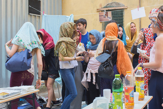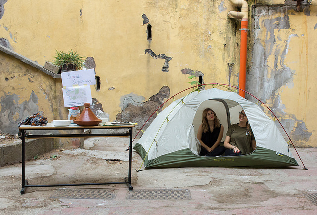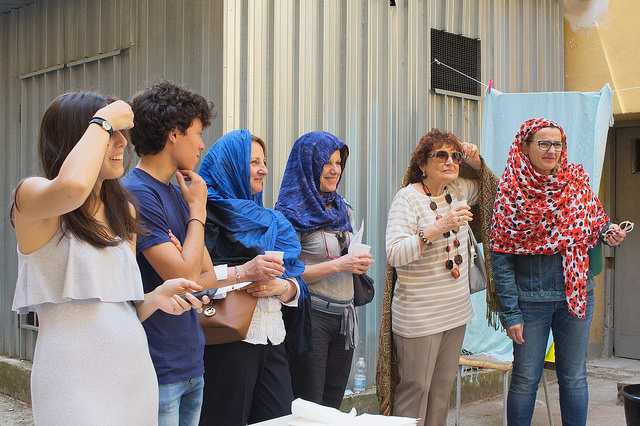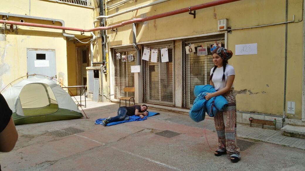 Ora sono qui a raccogliere i frutti di quanto realizzato: la macchina organizzativa, provata il giorno precedente, si rimette in moto e fili e mollette vengono appesi alle pareti del cortile per esporre foto a colori formato A4 della loro esperienza e articoli del blog. Cinque aree, corrispondenti alle uscite fatte dai ragazzi, sono dedicate ad altrettanti stand. Una tenda, un sacco a pelo, un simil letto e una tajine piena di cous cous al pollo tritato e zenzero nell’area dei transitanti rappresentati da CivicoZero e Baobab; felafel, un tappeto a terra e tanti veli in quella della Grande Moschea; nuvolette con domande, una sagoma per la foto e un foglio con scaletta a quella per l’intervista. Lo stand della scuola di italiano per stranieri ha libri, lavagna e bandiere colorate; quello della cittadinanza un passaporto gigante, patatine e bitter. Varie sono le forme che i ragazzi hanno scelto per presentare il lavoro svolto ai loro compagni: chi con una scenetta, chi coinvolgendo il pubblico in attività, chi con entrambe le cose.