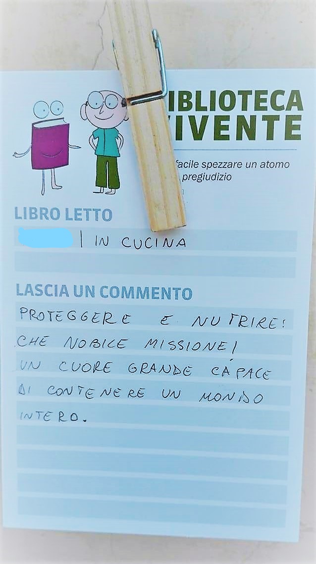 “In Serbia ci sono i miei parenti e mio fratello. Ho pensato di andare a vedere il paese da dove provengo, vorrei andare a trovare i miei familiari, ma al momento ci sentiamo per telefono… ma non vivrei in Serbia, ho deciso di stare qui in Italia, lavorare onestamente per ottenere un giorno finalmente la cittadinanza italiana. In questo paese gli apolidi sono 15.000, in tutto il mondo ce ne sono 10 milioni. La strada è ancora lunga… Servono dieci anni di residenza e un contratto di lavoro a tempo indeterminato”.Roberto prova a immaginare di scrivere i prossimi paragrafi: “Da qui a dieci anni mi vedo in Italia, con un lavoro onesto. Mi piacerebbe studiare giurisprudenza. A scuola in diritto me la cavavo bene”. Le pagine più tristi del libro sono quelle che raccontano le discriminazioni subite: “Di pregiudizi razziali ne ho affrontati tanti, sia a scuola che sul lavoro. Mi dicevano: Sei serbo? Ah quindi sei uno zingaro”.Lo slogan delle Biblioteche Viventi è quello di Albert Einstein, anche lui apolide dal 1896 al 1901, che recita: “è più facile spezzare un atomo che un pregiudizio”. Roberto oggi, con la sua determinazione e la sua buona volontà, è riuscito a spezzare molti pregiudizi. “Io penso che per giudicare una persona devi mangiarci insieme pane e cipolla”. “Ma è un detto serbo?”. “No, è un detto mio! Serve del tempo per conoscere una persona…io credo che con la mia storia potrei insegnare qualcosa agli altri”. “Senza Patria” è un libro dallo stile semplice e asciutto. Ma ogni riga fa nascere nella mente e nel cuore del lettore tante domande, emozioni e riflessioni, ponendolo di fronte agli ostacoli quotidiani di un apolide. E il finale, ancora da scrivere, apre le porte a un grande sogno, quello di diventare un cittadino.Il secondo libro, “In cucina” è fresco, divertente, di quelli da leggere tutti d’un fiato. Le righe, ipertrofiche, dal ritmo incalzante, sono costellate di espressioni dialettali, in cui non mancano elementi di slang. È la storia di un ragazzo timido, ma simpatico e pronto alla battuta. “Non ho voglia farmi fotografare, non scrivere il mio nome. Chiamami “er puglie”. Non perché faccio pugilato, ma perché avevo un cane che si chiamava Tyson”. Scritto un po’ in italiano e un po’ in dialetto romano, questo libro racconta la passione per la cucina di un diciannovenne che vive in un campo Rom.“Sto ai fornelli da quando ero piccolo. Il primo piatto che ho cucinato erano uova e salsicce, preparate per la mia numerosa famiglia. Siamo tanti nel campo Rom, parenti, cugini e zii. Origini serbe, ma dentro romani al 100%, e in casa parliamo una lingua che è tutto un mix”.  Un’infanzia segnata da episodi di discriminazioni da parte dei coetanei. Poi, l’Istituto Alberghiero Don Bosco dà a “er pugile” l’opportunità di fare uno stage nella mensa di un centro estivo. “Il primo giorno in cucina andò bene, ma per prima cosa mi fecero tagliare una zucca enorme, una fatica! Però ho imparato tanto, oggi faccio di tutto e lavoro nella cucina di un ristorante di via Teano. Lavorare mi ha aiutato a credere di più in me stesso. Oggi, appena sento per la strada qualche insulto o battutaccia, rispondo senza paura: “Che te frega se so’ Rom?”.Ho un mito, lo chef Cannavacciuolo, e un sogno: aprire un ristorante multiculturale, offrire a tutti i cittadini di Roma piatti economici e di diversa provenienza. Magari un giorno andrò anche in Spagna per imparare a cucinare qualche piatto tipico spagnolo. Il mio ristorante sarebbe un posto per ritrovarsi, stare insieme e mangiare bene, non uno di quei ristoranti dove i piatti sono vuoti e spendi una fortuna. Ovviamente preparerei i miei cavalli di battaglia: la moussaka, la carbonara e l’amatriciana, che sono i miei piatti preferiti, e poi ovviamente la torta al cioccolato e cocco. Sarà un posto per tutti, tranne che per i razzisti”.Le pagine scorrono in fretta, le righe filano lisce, svelando anche l’amore del protagonista per la città in cui è nato e cresciuto: “Io sono romano e romanista, ma odio la violenza negli stadi, è qualcosa che non capisco… macchia il nome della nostra città. La cosa più bella di Roma? Il Colosseo. Sono stato anche in Serbia, ma in nessun posto mi sento bene come a Roma”. Nella mezz’ora dedicata alla consultazione del libro, non c’è più tempo per le domande. Resta un sorriso stampato sulla faccia e un augurio sincero per “il pugile” e il suo sogno di unire le persone con la cucina.In un’ora, due libri umani sono stati letti. Gli utenti della biblioteca appendono ad un filo le recensioni dei libri umani che hanno ascoltato. Questi bigliettini saranno poi consegnati direttamente ai ragazzi. Il racconto, lo sguardo, la parola, hanno lasciato nei lettori molto di più di semplici informazioni. Gli utenti della Biblioteca Vivente hanno scritto nelle recensioni parole non solo di incoraggiamento, ma anche di gratitudine e apprezzamento per il regalo ricevuto.        «L’esistenza è una serie di note a piè di pagina in un ampio, oscuro capolavoro incompiuto»Vladimir Nabokov