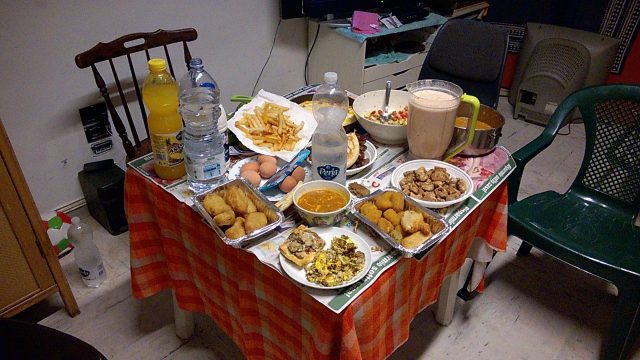 La cena è quasi pronta e ci si può spostare al sesto piano, a casa di uno del gruppo: la tavola è imbandita con dolcetti marocchini, datteri, latte, fichi, pane tipico, zuppa e uova sode da un lato.
