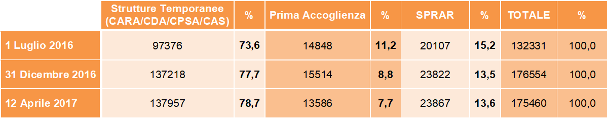 Auspicano di contro una “definitiva implementazione di un sistema unico di accoglienza attraverso la fattiva collaborazione degli enti locali e con il prezioso contributo del terzo settore. In particolare con la raccomandazione della piena applicazione della direttiva del Ministro dell’Interno dell’11 ottobre 2016, “Regole per l’avvio di un sistema di ripartizione graduale e sostenibile dei richiedenti asilo e dei rifugiati sul territorio nazionale attraverso lo SPRAR”. Fondamentali sono i dati sui quali sono state elaborate tali considerazioni e aventi come fonti il Cruscotto Statistico del Ministero dell’Interno. Dati che ad oggi risultano ancora “scomparsi”, ma che hanno permesso di quantificare i diversi tipi di accoglienza prendendo come date il quadro del 1 Luglio 2016, il 31 Dicembre 2016 e l’ultimo pubblicato del 12 Aprile 2017.