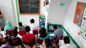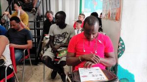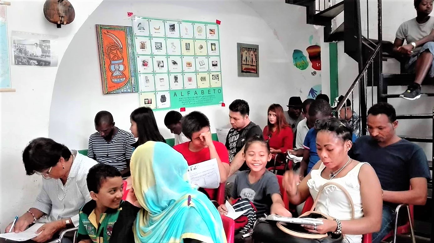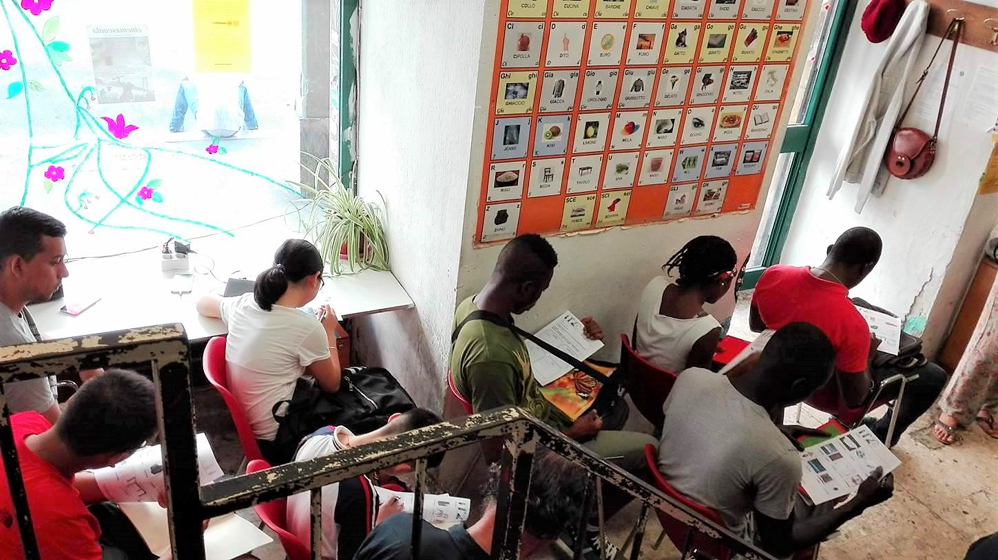 Quella di FOCUS – Casa dei Diritti Sociali è una delle tante scuole della Rete Scuolemigranti che non chiude mai: presente sul territorio dal 1985, si occupa di alfabetizzazione agli stranieri adulti. È aperta tutto l’anno, dal lunedì al venerdì, e offre ogni settimana più di sessanta lezioni gratuite ai tanti migranti che trovano nei piccoli locali di via Giolitti, dietro la stazione Termini, un importante punto di riferimento: accanto alla scuola c’è uno sportello di orientamento, che si avvale della consulenza di operatori, di un legale e di un piccolo ambulatorio. Durante l’anno, le lezioni si svolgono la mattina, alle 10.30, il pomeriggio, alle 15.00 e alle 17.00, e di sera, alle 19.00, un orario comodo per i tanti stranieri che arrivano dopo il lavoro.Per l’estate, l’orario è stato ridotto alla fascia mattutina e alle 17.00. Sono le 16.30 di venerdì e lo spazio antistante l’ingresso è già affollato. Mezz’ora prima dell’inizio della lezione viene compilata una lista di prenotazione alla lezione; in quel lasso di tempo, l’entrata della scuola si trasforma in uno spazio di incontro e socializzazione: tanti studenti fanno conoscenza, parlano tra loro e aspettano impazienti di entrare in classe. I locali sono piccoli, la struttura è fatiscente, ma l’atmosfera è vivace e le classi sono accoglienti e colorate: i volontari hanno affisso alle pareti cartelloni, cartine geografiche, fotografie e hanno dipinto fiori e alberi sui muri scrostati.Gaetano e il murale col suo ritratto realizzato dall’artista Mauro SgarbiGaetano, che a via Giolitti fa il venditore ambulante da quarant’anni, racconta con orgoglio che ha visto nascere quella scuola: “Mi sento un po’ il custode della scuola. Ho le chiavi, per qualsiasi problema i volontari e gli studenti possono chiedermi un aiuto o un’informazione. Sono contento di stare qui, ho conosciuto tante belle persone e se non ci fosse stata questa scuola, che avrei fatto tutto il giorno oltre a lavorare? Nei momenti di noia, avrei solo potuto guardare le macchine che passano. Senza questa scuola, nella mia vita sarebbe mancato qualcosa, anzi, più di qualcosa”.”Ogni tanto la sera metto il mio banchetto nell’aula del piano terra. Pulisco il bagno e raccolgo qualche cartaccia, ma per me non è un peso, lo faccio volentieri”. La presenza di Gaetano, la sua collaborazione e dedizione, sono state premiate dall’artista Mauro Sgarbi con un prezioso omaggio: un suo ritratto sul muro di via Giolitti, che si è aggiunto alle altre opere murali, realizzate nel 2015, che l’artista ha regalato alla scuola, ovvero il profilo di Dante Alighieri e di una donna nera che si guardano, e un ritratto di Trilussa con le parole di una sua poesia. Turisti e passanti che si fermano a fare le foto alle opere di Sgarbi (e a Gaetano) rilevati in un’ora: quattro.”In questa scuola ho conosciuto tante persone e ho imparato l’italiano quando sono arrivata a Roma. Per me è stata veramente importante. Ora mi esprimo bene, non mi sento più timida come ero i primi tempi, e a settembre inizierò un corso di cucina all’Italian Chef Academy”. Joan Ivy ha 20 anni e viene dal Kenya. Quando è arrivata a scuola, parlava poco, ma andava a scuola regolarmente e con il tempo ha fatto amicizia con tanti studenti e insegnanti. Via Giolitti è un po’ come la sua seconda casa. Porterà anche la sorella in questa scuola, “perché è appena arrivata e a settembre vuole iscriversi all’università per diventare infermiera”.Joan IvyÈ una vera macchina dell’accoglienza ai migranti, la scuola di via Giolitti, messa in moto da un nutrito gruppo di volontari che ogni settimana garantisce lezioni di lingua italiana A1, suddivisa su tre livelli: base, intermedio e avanzato. L’offerta didattica è ricca e costantemente monitorata dal gruppo di alfabetizzazione con seminari di aggiornamento: ci sono le lezioni per sole donne il giovedì, quelle di prealfabetizzazione per i migranti totalmente analfabeti, quelle specifiche per gli apprendenti cinesi nel fine settimana e i corsi coordinati di italiano A2 per il rinnovo del permesso di soggiorno.Pensionati, volontari, operatori di Servizio Civile e tirocinanti: durante tutto l’anno gli insegnanti, coordinati dal referente Augusto Venanzetti, si organizzano settimanalmente per completare l’orario delle lezioni, riuscendo a fornire ai tanti migranti, provenienti da Asia, Africa, America del sud e Europa dell’est, un programma di lezioni estremamente flessibile: la frequenza, ovviamente gratuita come in tutte le scuole della Rete Scuolemigranti, non è obbligatoria, né scandita da orari prefissati, non necessita documenti, solo una semplice iscrizione, una scheda conoscitiva. Che entri la mattina, il pomeriggio, o la sera, che frequenti una volta a settimana o una volta al mese, lo studente troverà sempre una lezione nuova e diversa.Le attività organizzate dai volontari non si limitano però solo alle lezioni di italiano: la missione della scuola, ovvero l’integrazione sociale dei migranti, passa anche attraverso le passeggiate turistiche del sabato, il cineforumdel lunedì pomeriggio, che proseguirà per tutta l’estate, la festa multiculturale che ogni dicembre si svolge nei locali della scuola Di Donato, il torneo di scacchi “La mossa del cavallo”, che ha raggiunto quest’anno la decima edizione, i gruppi di lavoro sui temi sensibili da trattare in classe, come la sessualità e la religione, e ultimo ma non ultimo, il laboratorio teatrale che ogni anno Magda Mercatali, attrice teatrale e insegnante, assieme a un gruppo di volontari, dirige, portando in scena gli studenti e le studentesse della scuola. Come per lo scorso spettacolo, anche la rappresentazione teatrale di quest’anno, “Gli dei dell’Olimpo” ha registrato il tutto esaurito al Teatro Belli di Trastevere.Non importa che i locali di via Giolitti siano vecchi e malmessi: tantissimi sono gli stranieri che nella 