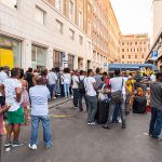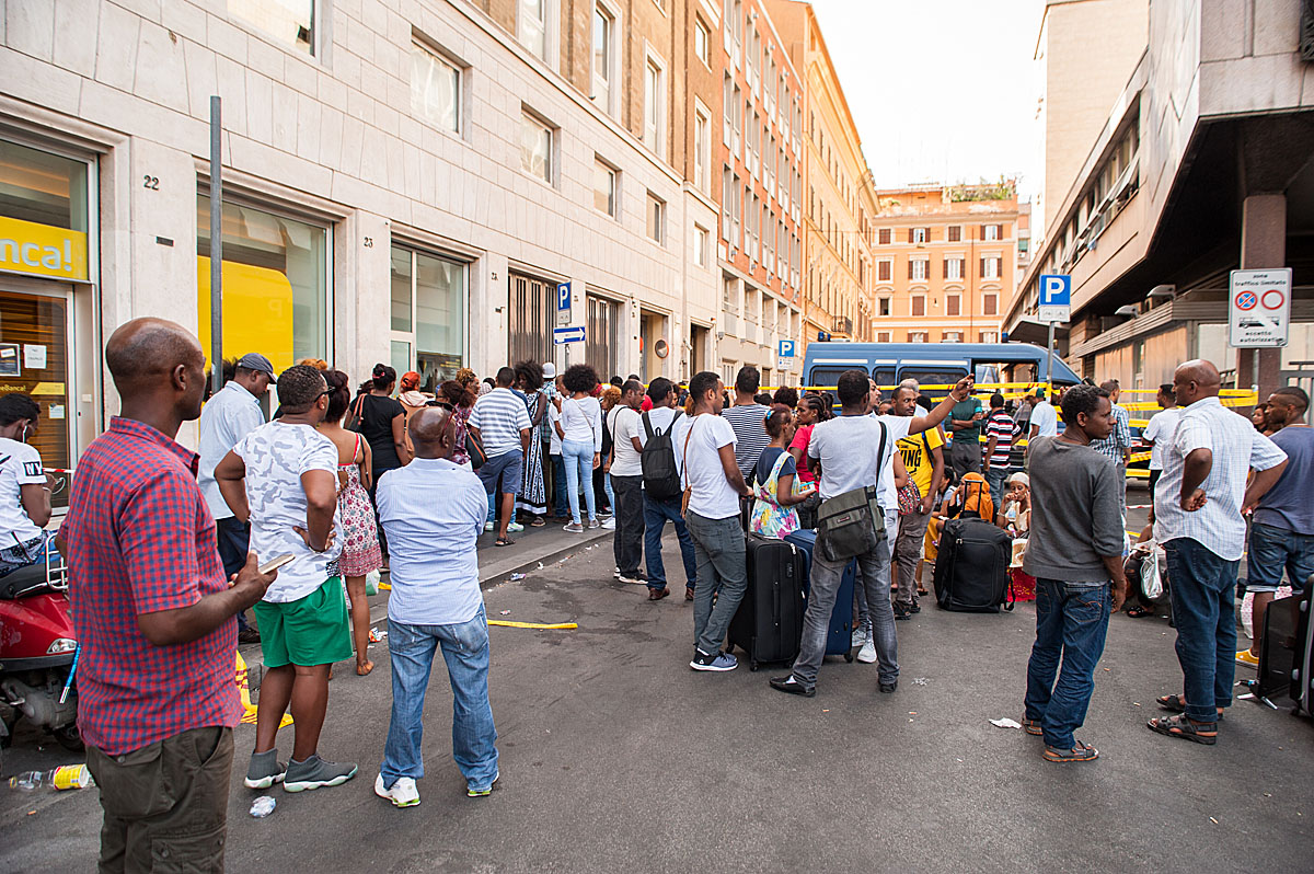 Intanto la fila per entrare a raccogliere le proprie cose rimaste dentro prosegue. Sotto il sole, silenziosamente e con tanta pazienza, uomini di diverse età e alcune donne aspettano. Sono in fila dalle 9 dopo il risveglio in piazza, dove circa 200 persone hanno passato la notte. Gli altri hanno trovato ospitalità presso amici e conoscenti. Ad alcune donne con bambini è stato permesso di dormire nel primo piano dello stabile sgomberato. C’è ancora tanta confusione su chi abbia ordinato lo sgombero. “Li hanno mandati via così senza dire niente, è disumano. Abito qui in Via dei Mille” commenta una signora venuta a chiedere informazioni, preoccupata ”Sono persone tranquille e pacifiche, non hanno mai dato fastidio in alcun modo. Mi dispiace: ora dove andranno? Si sa? Hanno già una sistemazione? Non capisco perché li abbiamo mandati via così”.