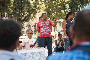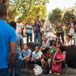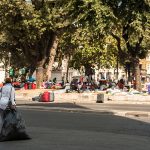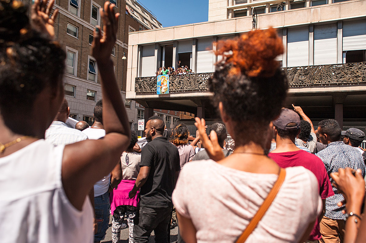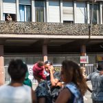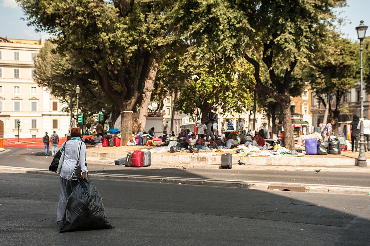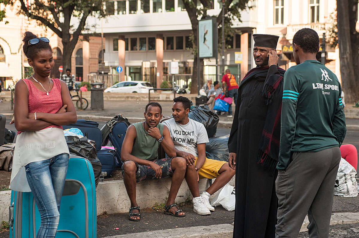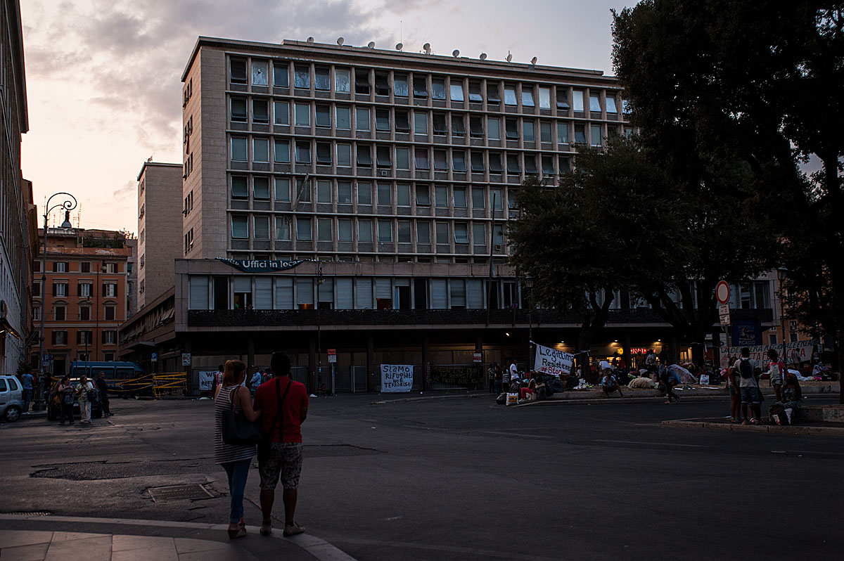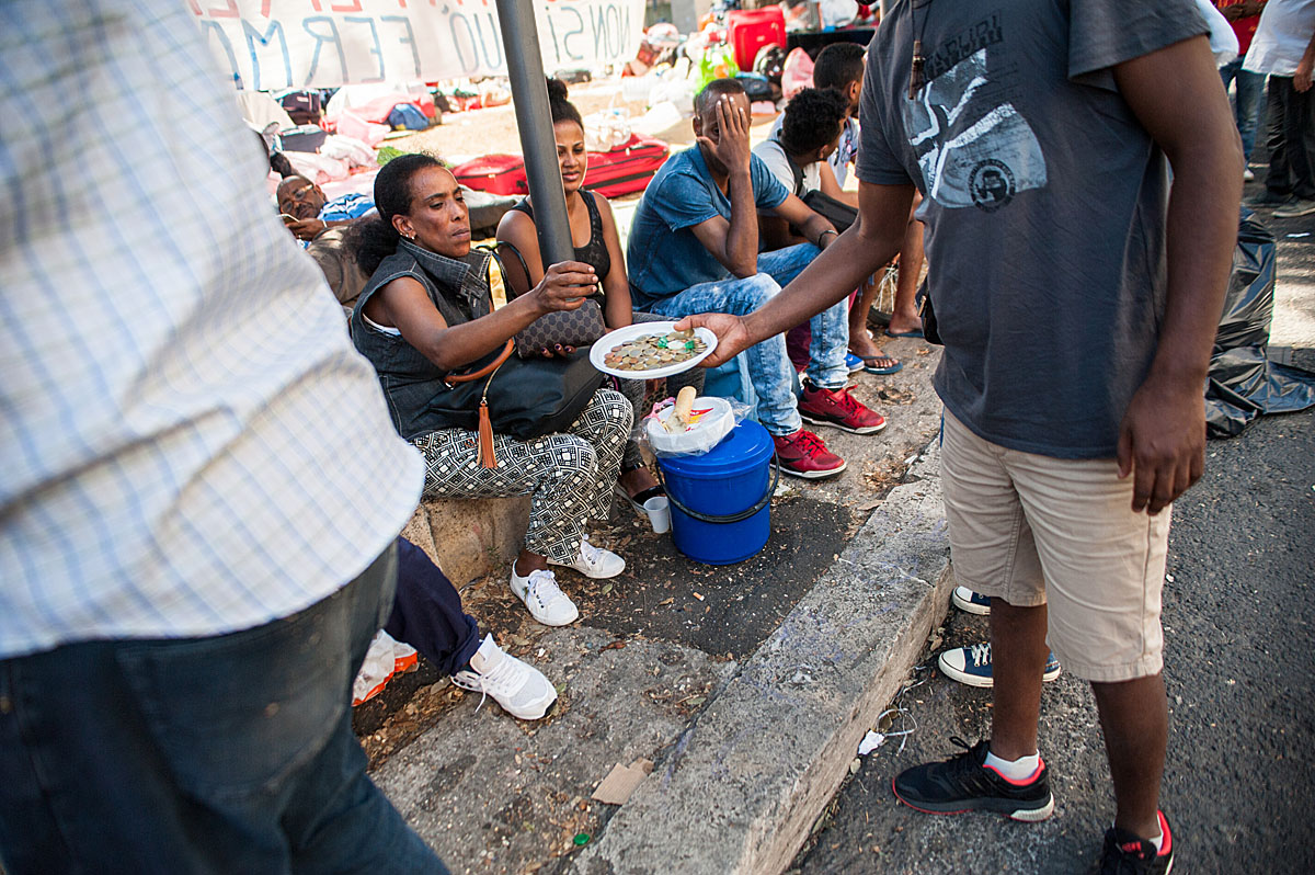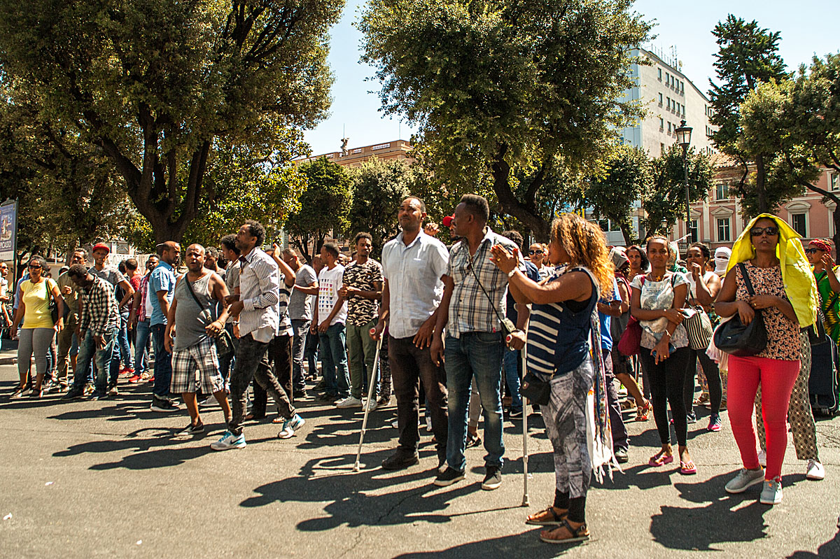 “Ho due bambine piccole, di 2 e 4 anni, che sono dentro con mio marito. Io sto andando in ospedale per la visita per il mio diabete. Quattro volte al giorno devo prendere le fiale di insulina e così mi permettono di entrare perché sono dentro un frigorifero”, racconta Sannait stringendo la sua cartella medica. Lei come la maggior parte degli 800 occupanti lo stabile sgomberato sabato 19 Agosto in Piazza indipendenza, sono provenienti dall’Eritrea. “Nel nostro paese c’è la guerra e abbiamo regolare permesso di soggiorno con protezione internazionale. Per noi va bene tutto, cerchiamo anche una casa condivisa perché sappiamo che anche gli italiani sono in difficoltà. Io lavoro facendo le pulizie quando capita e dove capita, mantenendo mio marito e i bambini. Per soli 160 euro al mese a volte. Abbiamo provato ad andare in Germania ma ci hanno rimandato qui perché siamo stati identificati in Italia. Così ci rimbocchiamo le maniche e facciamo il possibile”. Poi guardando le finestre aperte del primo piano prima di andare in ospedale “Le bambine sono dentro con il papà oggi, ma non so cosa sarà domani, neanche oggi pomeriggio”. La piazza si riempie: la notizia di un incontro fra Padre Mosè Zerai portavoce, insieme a 3 rappresentanti degli sgomberati, e l’assessora Baldassarre, apre nuove speranze. Insieme si attende. Un ragazzo rientra da lavoro, dai suoi due turni di notte alla TNT di Via Salone, è stanco ma non ha tempo di dormire, cerca soluzioni. I bambini salutano dalle finestre cantando e dando il ritmo alla piazza in attesa sempre più ghermita di curiosi, stampa e rappresentanti di associazioni e ONG.