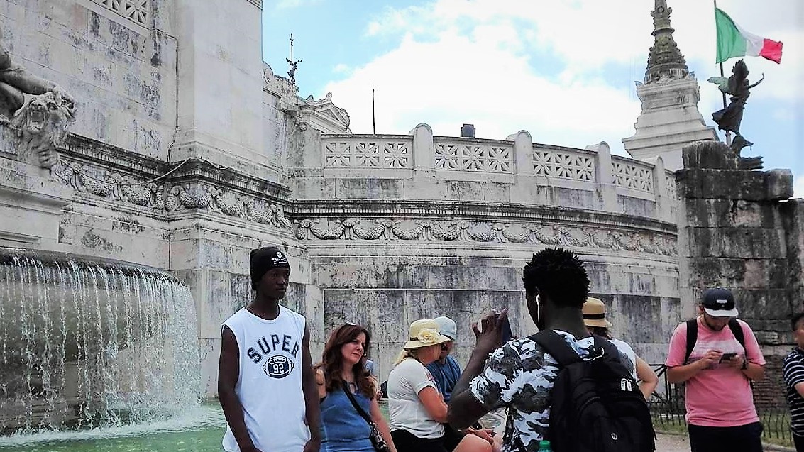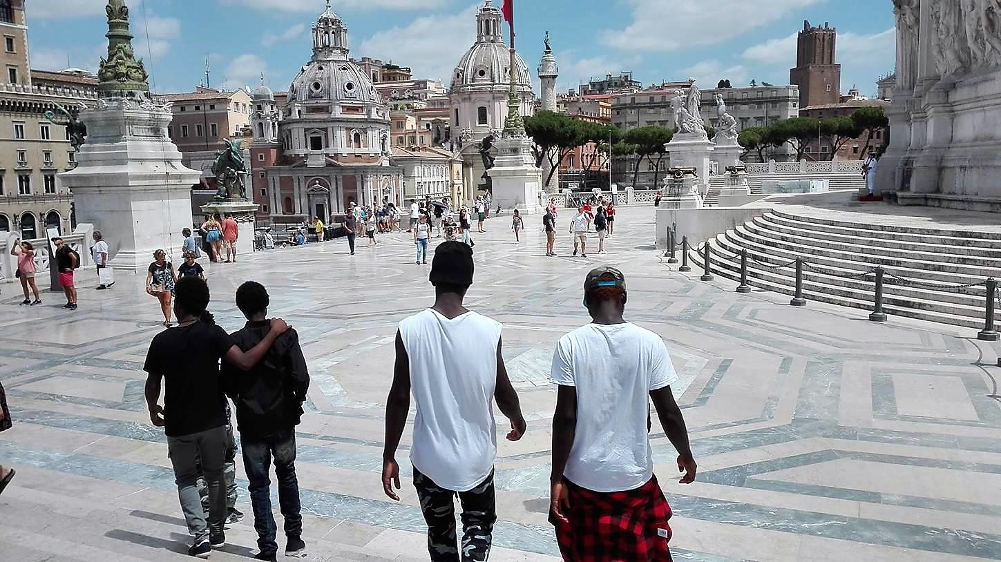 Sono le ore 11:00 di un caldissimo venerdì d’estate, la via che dal Colosseo porta ai Fori Imperiali è gremita. Al caldo e al traffico i cittadini romani ci sono abituati e la città è quella di sempre: bella, imponente e luminosa. I turisti da ogni angolo di mondo si riversano all’entrata del Colosseo, simbolo della città eterna.Dianne, Abdallah, Camara, Mountaga, venuti dalla Guinea e Young, nigeriano, vedono per la prima volta il Colosseo con i loro occhi. Conoscono la storia di Spartaco, dei gladiatori e degli imperatori, ma lo stupore provato davanti quel grandioso monumento, non potevano davvero immaginarlo. Sono migranti molto giovani, hanno poco meno di vent’anni e sono arrivati in Italia da pochi mesi: da maggio vivono a Gallese, piccolo centro della provincia di Viterbo. Sono migranti approdati in Italia dopo un lungo viaggio della speranza, dopo la Libia, dopo il Mediterraneo, e oggi sono alcuni dei beneficiari del progetto “Terra Madre” del Centro di Accoglienza Straordinaria gestito dalla cooperativa Agorà. A Gallese la loro vita negli ultimi mesi si sta pian piano ricostruendo: vivono insieme in un appartamento nel centro storico, un luogo in cui la vita scorre tranquilla e in cui si sono fin da subito ambientati, anche grazie all’accoglienza del sindaco del paese e dei cittadini, che ormai li salutano e li chiamano per nome. Dopo il loro arrivo a Gellese le giornate sono state stravolte dalla nuova avventura di vivere insieme, ma il loro rapporto di amicizia è solido e li aiuta ad affrontare le difficoltà quotidiane e forse anche la nostalgia di casa. “Questa è la mia famiglia” dice Camara, quando guarda sul cellulare la foto del gruppo in posa davanti ai Fori imperiali. Da giugno seguono i corsi di italiano a Orte, città sede del progetto, un’attività che li appassiona e nella quale dimostrano tutto il loro impegno; nel tempo libero, per ora c’è solo il pallone e qualche uscita per il paese. Il Centro di accoglienza, che promuove un progetto di integrazione diffusa, presto organizzerà una squadra di calcio dilettantistica. La gita a Roma è stata una richiesta arrivata proprio dai migranti partecipanti al progetto, e l’équipe della cooperativa si è fin da subito attivata per realizzare questo desiderio, riconoscendone il grande valore proprio in virtù del modello di accoglienza che si propone di attuare: ovvero quello di creare non solo “integrazione”, ma “interazione” col territorio italiano. Dopo tante peripezie, i ragazzi ora sono più sereni e il lavoro, nonché gli obiettivi degli operatori del Centro, sono quelli di aiutare i nuovi arrivati a costruire il proprio futuro qui in Italia. Percorso non facile, ma possibile: i ragazzi hanno già fatto amicizia con qualche coetaneo, amano andare alle feste in paese, e in un futuro non troppo lontano sperano di concretizzare il desiderio di lavorare.Visitare Roma per la prima volta è stata una grande emozione: accompagnati da tre operatori del centro, non sono riusciti a contenere l’entusiasmo e la curiosità davanti ai Fori Imperiali, alla statua di Giulio Cesare e alle “antichitate” che si stagliavano tutt’intorno. Salendo fino in cima all’Altare della Patria, si sono fermati a lungo ad ammirare Piazza Venezia dall’alto e il cupolone che risaltava in lontananza. “Lì c’è il Papa”, li informa un’operatrice: sembrano increduli e ammirano per qualche minuto la vastità di una città di cui conoscevano solo qualche immagine di Google. Impossibile resistere ai selfie, che prontamente inviano ad amici e familiari. Divertiti, hanno passeggiato sotto il sole rovente, guardando i turisti in fila all’ingresso del Colosseo, fermandosi a godere dei piccoli spettacoli offerti da artisti e musicisti di strada. Il loro italiano è ancora povero, “Roma è bella”, “Roma è grande e antica” sono le sole parole che sono in grado di pronunciare per esprimere il loro interesse e la loro contentezza, ma il senso di meraviglia, più che con le parole, viene fuori dagli occhi. Un’esperienza tenera e commovente, una giornata che i ragazzi custodiranno gelosamente tra i propri primi ricordi in Italia. Un momento di integrazione vera, che a breve si ripeterà per gli altri gruppi di beneficiari del progetto “Terra Madre”.