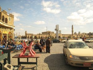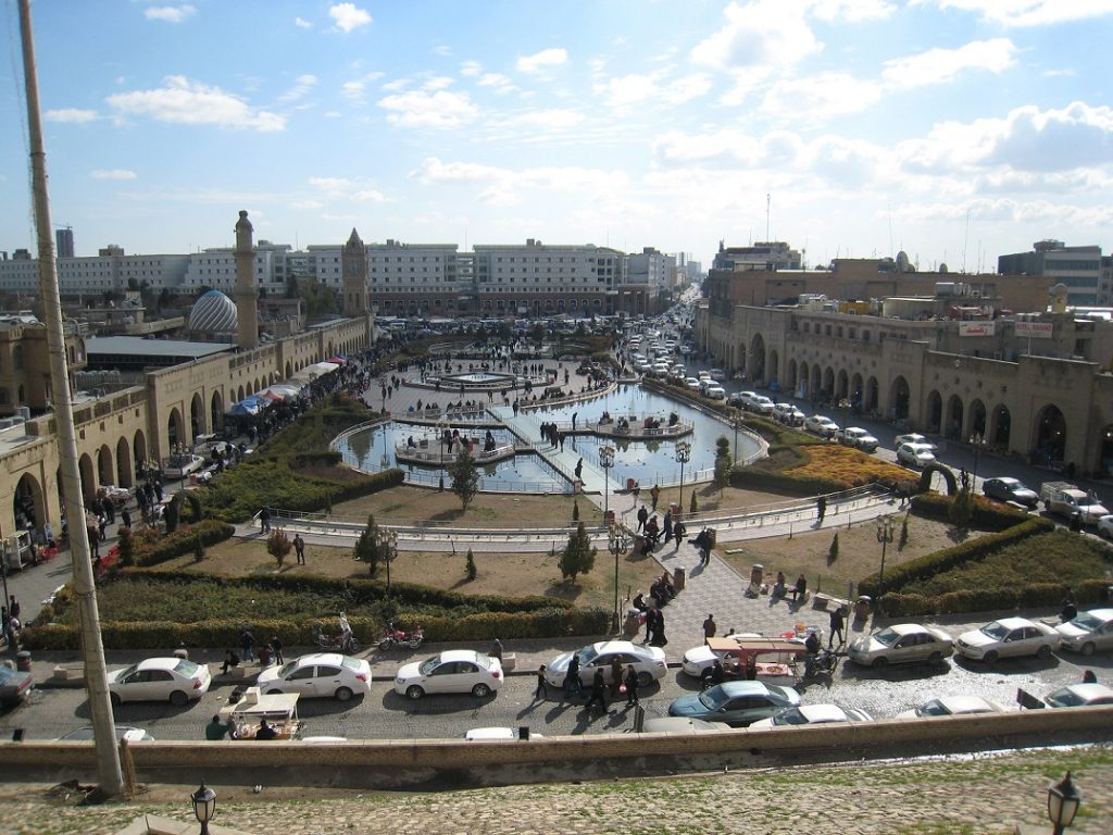 Il bazar risale al XIII secolo, ma questa città che sorge ai bordi settentrionali della Mesopotamia è più antica perché è stata abitata continuativamente da seimila anni. In tempi recenti il Qaysari è diventato il lato occidentale di una grande piazza arredata con specchi d’acqua e isolette, fontane e getti d’acqua peraltro, inutile dirlo, chiusi. Anche il lato orientale della piazza è stato adibito a mercato ma lì prevalgono altri commerci: condizionatori per l’aria, pompe idrauliche, ferramenta, lampadine, sedie a rotelle e stampelle. La piazza è chiusa a meridione dagli edifici di un grande magazzino. A Nord invece ritroviamo la collinetta della Cittadella, con le sue alte mura di mattoni e la porta ogivale.
