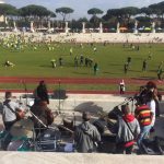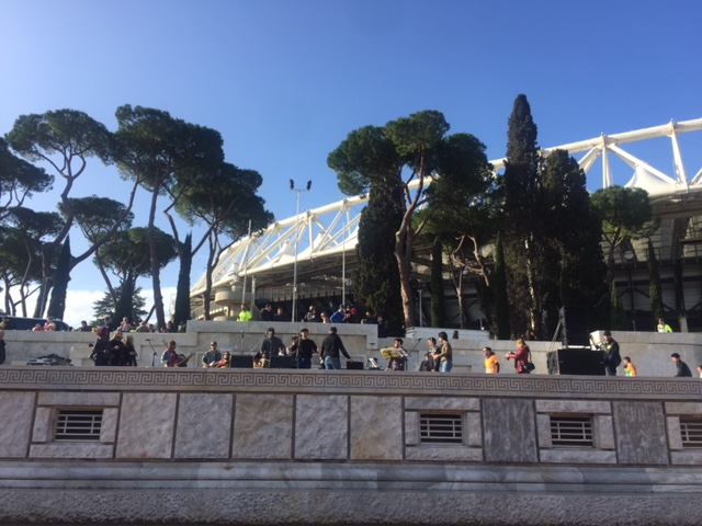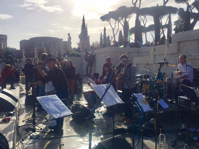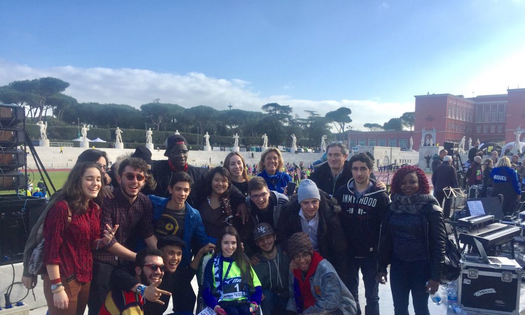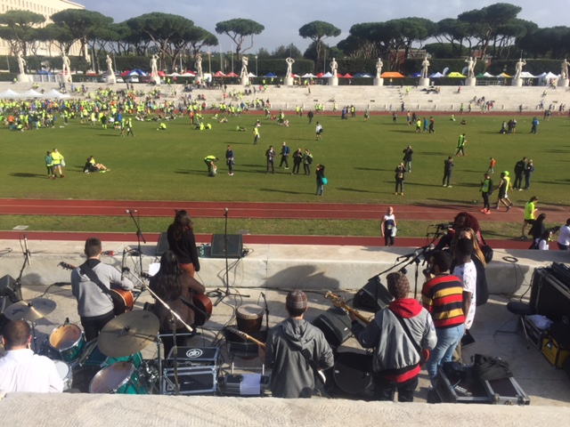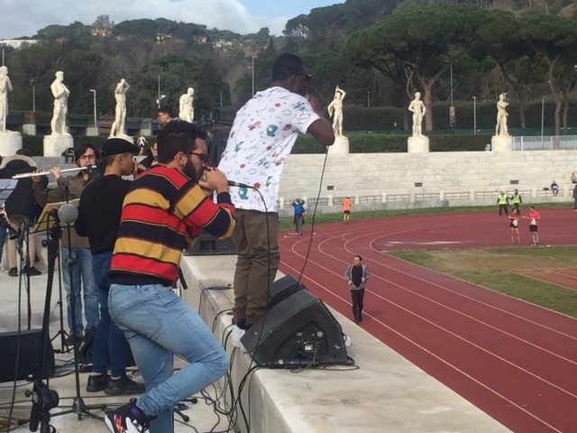 “Io finisco l’amatriciana, so’ cresciuto coi cucchiai di Totti, i film di Alberto Sordi e per venirti incontro parlo la tua stessa lingua”, recitano i versi di “Under”, l’ultimo singolo a suon di rime rap della Piccola Orchestra di Tor Pignattara, che lo scorso 21 gennaio si è esibita allo Stadio dei Marmi durante la XIX edizione de La Corsa di Miguel. Un testo che, come spiega Pino Pecorelli, direttore artistico del progetto e componente dell’Orchestra di Piazza Vittorio, “tenta di smontare il teorema del razzista che, semplicemente per il colore della pelle, giudica una persona che di fatto è nata e cresciuta in Italia.”Senegal, Ghana, Argentina, Filippine, Bangladesh, Polonia, Francia… La Piccola Orchestra di Tor Pignattara è composta da 22 ragazzi tra i 16 ed i 20 anni italiani, immigrati di seconda generazione e richiedenti asilo che suonano musica da ogni parte del mondo e cantano in diverse lingue. “Un progetto”, continua Pecorelli, “che è nato da un’idea del produttore e musicista Domenico Coduto nel 2012 nel cuore multietnico di Tor Pignattara, quartiere che una volta era l’emblema della romanità ma che negli ultimi anni è diventato il crocevia dell’immigrazione. Lo scopo era quello di creare un’orchestra di giovani professionisti che avessero origini diverse. Così abbiamo iniziato come un laboratorio e dopo diversi riconoscimenti, tra cui il premio MigrArti l’anno scorso, si è trasformato in un progetto professionale vero e proprio. Inoltre, nel corso del tempo abbiamo ricevuto diversi finanziamenti e, anche se per il momento non abbiamo le risorse sufficienti, il nostro obiettivo è quello di diventare una scuola di musica e siamo sempre in continua evoluzione e aperti all’ingresso di nuovi ragazzi,” spiega Pecorelli.Un progetto molto ambizioso, nato anche sulla base dell’esperienza dell’Orchestra di Piazza Vittorio della quale Pecorelli fa parte da quindici anni. “Potrebbero sembrare progetti molto simili ma mentre l’Orchestra di piazza Vittorio è un gruppo di musicisti stranieri che raccontano la propria storia e il proprio viaggio, la Piccola Orchestra di Tor Pignattara, invece, è formata da ragazzi che nella maggior parte dei casi sono nati in Italia, non hanno la cittadinanza italiana ma vogliono comunque raccontare la loro romanità”, spiega Pecorelli.Jasper, il bassista della Piccola orchestra di Tor Pignattara durante il concerto.È il caso di Jasper, uno dei componenti più giovani della band, di origini filippine. La sua passione per la musica è talmente forte che per lui tutto diventa un mezzo per poter suonare. Anche la bocca, con cui fa la beatbox e riproduce i suoni degli strumenti mentre canta. “Siamo una vera orchestra perché ognuno di noi mette nelle canzoni la propria individualità e personalità e sento che da quando la frequento sono migliorato tantissimo,” spiega il giovane diciassettenne con un grande accento romano. Infatti, anche se per il momento non è riuscito ad ottenere la cittadinanza italiana, Jasper è nato e cresciuto a Roma, nel quartiere di Rebibbia. “Il mio passaporto è di un paese, le Filippine, nel quale sono andato soltanto una volta in vacanza. Quando mi chiedono come mi trovo a Roma è come se mi chiedessero come mi sento a casa mia.” Jasper ha conosciuto la Piccola Orchestra di Tor Pignattara due anni fa tramite il batterista della band, Luca, uno dei pochi ragazzi italiani che la frequentano. “La musica è tutto per me. Grazie al mio maestro d’asilo, di origine africana, ho scoperto questa mia grande passione per i ritmi etnici anche se attualmente suono un genere musicale più attuale e giovanile”, confida il ragazzo mentre infila le sue bacchette nello zaino.Come Luca c’è Simone, il bassista, anche lui appassionato dei ritmi africani che attualmente studia al conservatorio di Santa Cecilia di Roma. Simone è nato e cresciuto a Roma da papà senegalese e madre italiana, e a differenza di Jasper, lui sì è riuscito ad ottenere la cittadinanza italiana. “La passione per la musica l’ho ereditata da mio padre che fa il percussionista, anche se purtroppo non sono in grado di suonare i ritmi etnici che lui produce. Io sono cresciuto a Roma e suono la musica che ascolto ogni giorno nelle mie giornate e con i miei amici, come oggi qui che a ritmo di rap, pop e reggae siamo riusciti a creare una bella atmosfera insieme a tutti i podisti,” spiega soddisfatto.Una giornata di musica, di sport ma anche di solidarietà e di integrazione dedicata a Miguel Benancio Sanchez, podista e poeta vittima del regime militare argentino in un’edizione da record che ha coinvolto quasi 5000 runner. “È il primo anno che partecipiamo a questo evento e siamo molto emozionati”, continua il direttore artistico. “La Corsa di Miguel ha un valore molto importante sulla diversità, sul razzismo e sulle tematiche sulle quali noi cerchiamo di lavorare con i ragazzi attraverso la musica. Infatti oggi abbiamo suonato non solo il nostro repertorio fatto di brani tradizionali e cover, ma anche canzoni inedite scritte dai ragazzi che quest’anno verranno pubblicate all’interno di quello che sarà il primo vero disco della Piccola Orchestra di Tor Pignattara. Sono i primi frutti di un grande lavoro che abbiamo portato avanti negli anni e che ci ha permesso di realizzare dei brani originali e scritti tutti insieme, e per me questa è la maggiore delle conquiste.“
