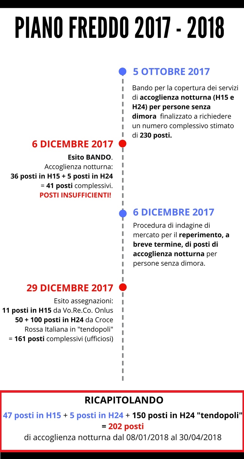 Partiamo dal bando del 5 Ottobre con l’“obiettivo di 245 accoglienze al giorno in centri notturni, di cui 80 in centri H24, e 200 accoglienze al giorno in centri diurni (H9 e H5)”.Dalla delibera del 6 dicembre i risultati sono allarmanti: soltanto 41 posti assegnati per l’accoglienza notturna, 35 in H15 e 5 in H24, fortemente insufficienti per coprire il fabbisogno richiesto preventivato. Così viene indetta una procedura di indagine di mercato per il reperimento, a breve termine, di posti di accoglienza notturna per persone senza dimora con scadenza 18 dicembre.Con la delibera del 29 dicembre 2017 vengono resi noti i nuovi risultati: 11 posti, H15 messi a disposizione da Vo.Re.Co. Onlus, e 50 + 100 posti, H24 in una “struttura qualificabile come tendopoli” della Croce Rossa Italiana.Tirando le somme: 202 posti (non tutti ancora effettivi) per l’accoglienza notturna.