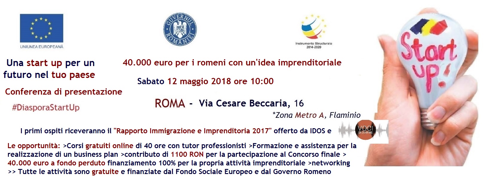 Essere cittadino romeno maggiorenne, dimostrare esperienza imprenditoriale, avere la residenza all’estero e tanta voglia di iniziare un’attività non agricola in Romania. Sono questi i principali requisiti del progetto “Una Start Up per un futuro nel tuo paese” che offre la possibilità ai cittadini romeni che vivono all’estero di seguire un corso di formazione gratuito e ottenere un finanziamento di 40.000 euro per avviare una start-up nel loro paese.