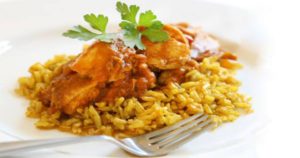 In padella con un filo d’olio mettere a imbiondire la cipolla tagliata a fette sottili. Quando la cipolla sarà appassita versare il pollo con la sua marinata e farlo cuocere 2-3 minuti per lato. Stemperare lo zafferano nel bicchiere di latte tiepido e aggiungerlo al pollo. Coprire il tutto con il coperchio e cuocere per 10 minuti. Passato il periodo togliere il coperchio, aggiungere ancora un po’ di sale se occorre e finire la cottura fino a quando il pollo sarà accompagnato da un fondo cremoso. Mettere il pollo biryani nel piatto accompagnato con riso basmati. Bhāla kṣudhā! (buon appetito!)