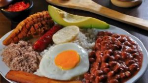 PreparazioneMettere a bagno i fagioli in acqua per coprire la notte prima della cottura. Cuocere i fagioli nella stessa acqua con metà dell’olio. Quando sono morbidi, aggiungere il sale. Nel frattempo, soffriggere la carne macinata in olio a fuoco medio alto, aggiungere la metà la cipolla e il pomodoro e mescolare bene. Tagliate la pancetta a pezzetti e la carne di maiale. Mescolare in una padella e cuocere per 10 minuti. Quando i fagioli sono teneri, aggiungere lo stufato rimasto e cuocere per 10 minuti. Poi in una padella, mettere l’olio per friggere le banane o tostones dolci e uova. Servite in vassoi con riso, avocado e arepas.