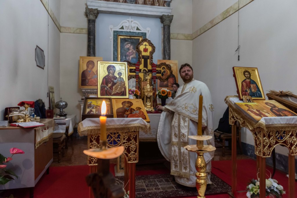 Non lontano dalla piazza centrale, nella Chiesa di Santa Maria Assunta, è appena finita la funzione ortodossa di mezzogiorno e sta per cominciare un battesimo. La comunità rumena di Riano, Sacrofano, e Castelnuovo, circa 500 persone, ha trovato qui un posto per pregare: “A Riano avevamo un garage per le funzioni, qui siamo ospiti ma presto dovremmo avere una struttura per noi”, dice padre Gabriel.