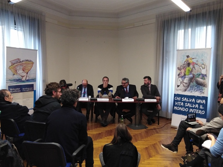 “Chi salva una vita, salva il mondo intero” recita lo slogan sullo sfondo del desk della conferenza stampa alla quale hanno partecipato Luca Maria Negro, presidente della Federazione delle chiese evangeliche in Italia (FCEI), Mimmo Lucano, ex sindaco di Riace, Riccardo Gatti, capomissione Open Arms, Giorgia Linardi, Portavoce di Sea-Watch in Italia, Benoit Micolon, fondatore dell’associazione Pilotes Volontaires.