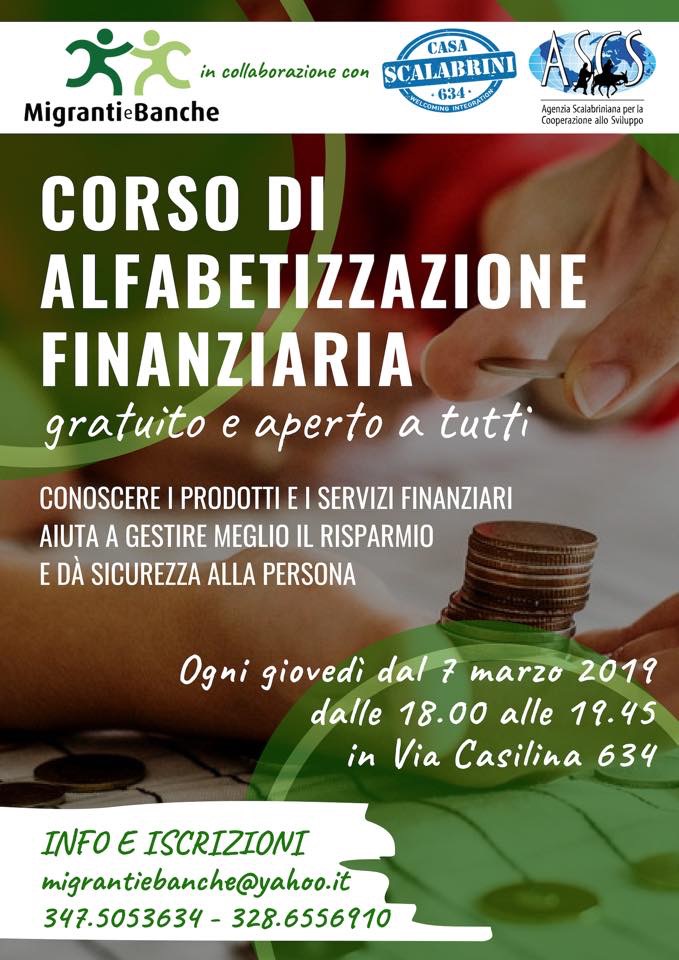 Inizierà il 7 marzo il nuovo corso di alfabetizzazione finanziaria per migranti organizzato dall’associazione Migranti e Banche in collaborazione con Casa Scalabrini 634, programma dell’Agenzia Scalabriniana per la Cooperazione allo Sviluppo – ASCS, sostenuto dalla congregazione dei missionari di San Carlo – Scalabriniani che “da 130 anni è al servizio dei migranti e dei rifugiati in 32 paesi del mondo”.Nata nel 2011 per volontà di un gruppo di bancari che hanno deciso di mettere a disposizione il proprio tempo e la propria esperienza per insegnare agli stranieri, a camminare con le loro gambe, una volta superata la fase della prima accoglienza nel nostro paese, l’associazione è alla quarta edizione di un corso che riscuote sempre più successo e risultati concreti.