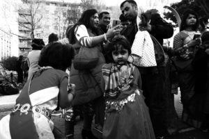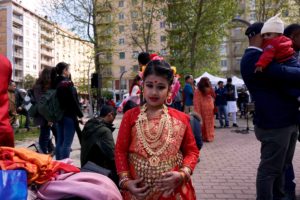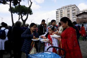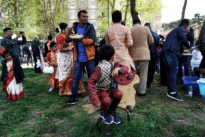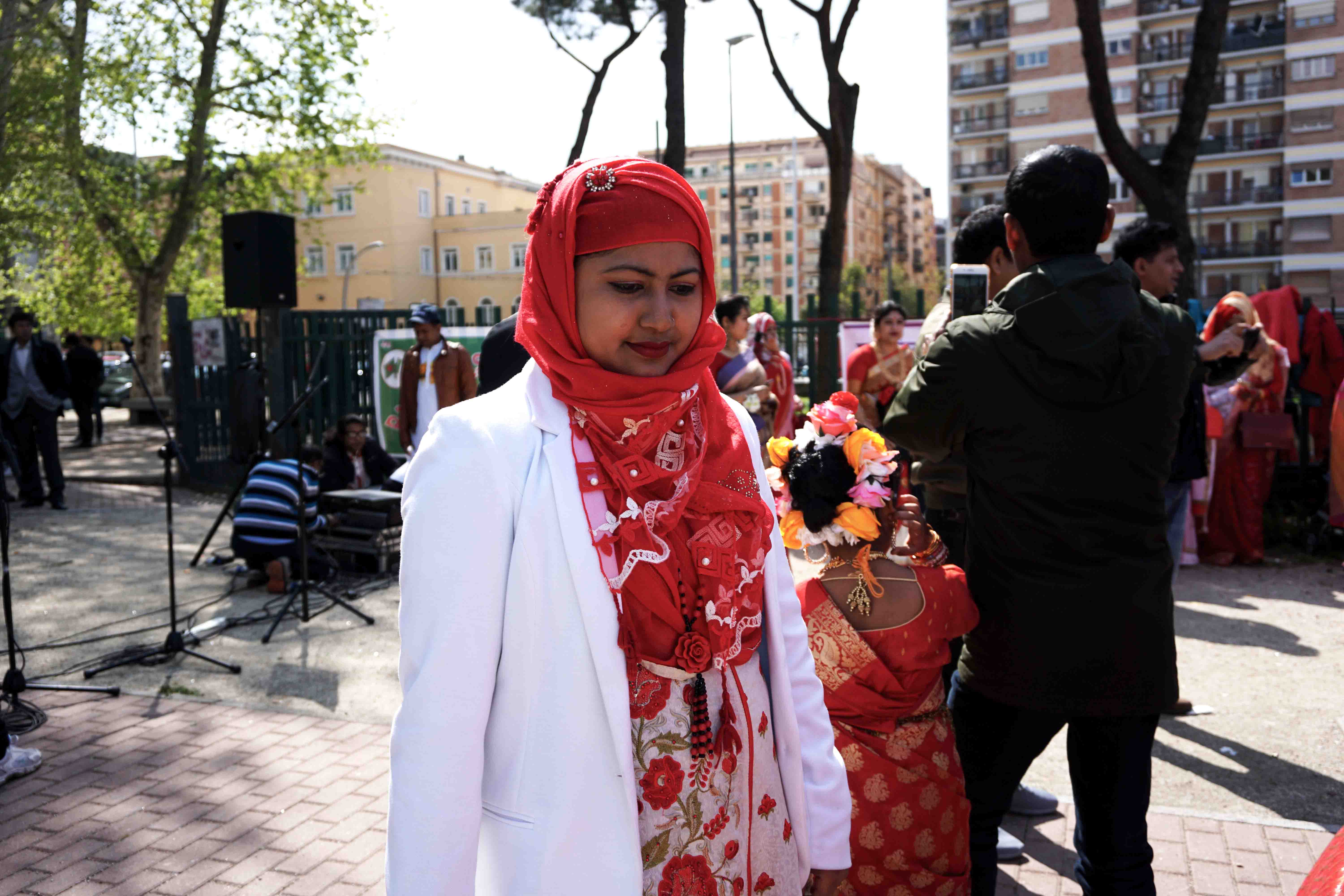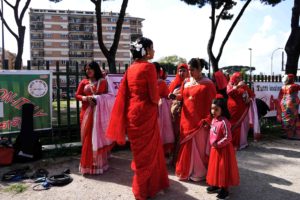 I festeggiamenti hanno preso vita nel primo pomeriggio quando i partecipanti si sono spostati verso l’area verde per mangiare. Le pietanze scelte e offerte gratuitamente a chiunque volesse festeggiare, partivano dall’immancabile Biryani riso basmati e pollo insaporiti da una particolare crema speziata piccante, la ricetta prevede che ogni pietanza venga cucinata e servita separatamente. Bengalesi e non hanno consumato il pasto servendosi, secondo la tradizione, con le mani. Il pranzo è stato un piacevole momento di interazione.Nel verde del giardino spiccava il tradizionale vestito rosso indossato dalle donne, il Sari: un abito dalle origini antichissime costituito da una unica fascia di stoffa, di lunghezza variabile, che viene avvolto intorno al corpo e non necessita di cuciture o bottoni. Impreziosito da ricami dorati o da gemme luminose, il colore prevalente è stato il rosso. Alcune ragazze hanno optato per l’arancio, altre per il verde acqua “per distinguersi ed essere riconoscibili”. Diverse donne portavano corone di fiori sul capo, bracciali e l’immancabile bindi. Anche gli uomini indossavano vestiti eleganti come vuole la trazione vuole: lunghe tuniche (kurta) o semplicemente una camicia.Dopo il pranzo, i festeggiamenti sono proseguiti con l’esibizione di alcune giovani danzatrici: bambine di tutte le età hanno sfoggiato i loro migliori passi di danza scanditi dal suono dei campanelli di un particolare accessorio musicale: il ghungroo ossia una cavigliera di stoffa interamente coperta da piccoli campanelli.Un altro importante momento ha visto Bachcu Dhuumacatu, pilastro dell’Associazione Dhuumacatu, annunciare e spiegare il Decreto Flussi.Erano presenti molte famiglie provenienti da stati diversi e di età e religioni differenti. La partecipazione di un così ampio spaccato generazionale ha messo in luce come ognuno abbia vissuto e percepito diversamente la festa. I più giovani, che non hanno mai avuto modo di celebrare il Capodanno nella terra d’origine perché nati in Italia, hanno accolto la tradizione emulando i più grandi che invece hanno cercato di ricreare in Italia una circostanza quanto più simile a quella originale. Il risultato è stato una sensazionale e coinvolgente celebrazione dal sapore orientale.