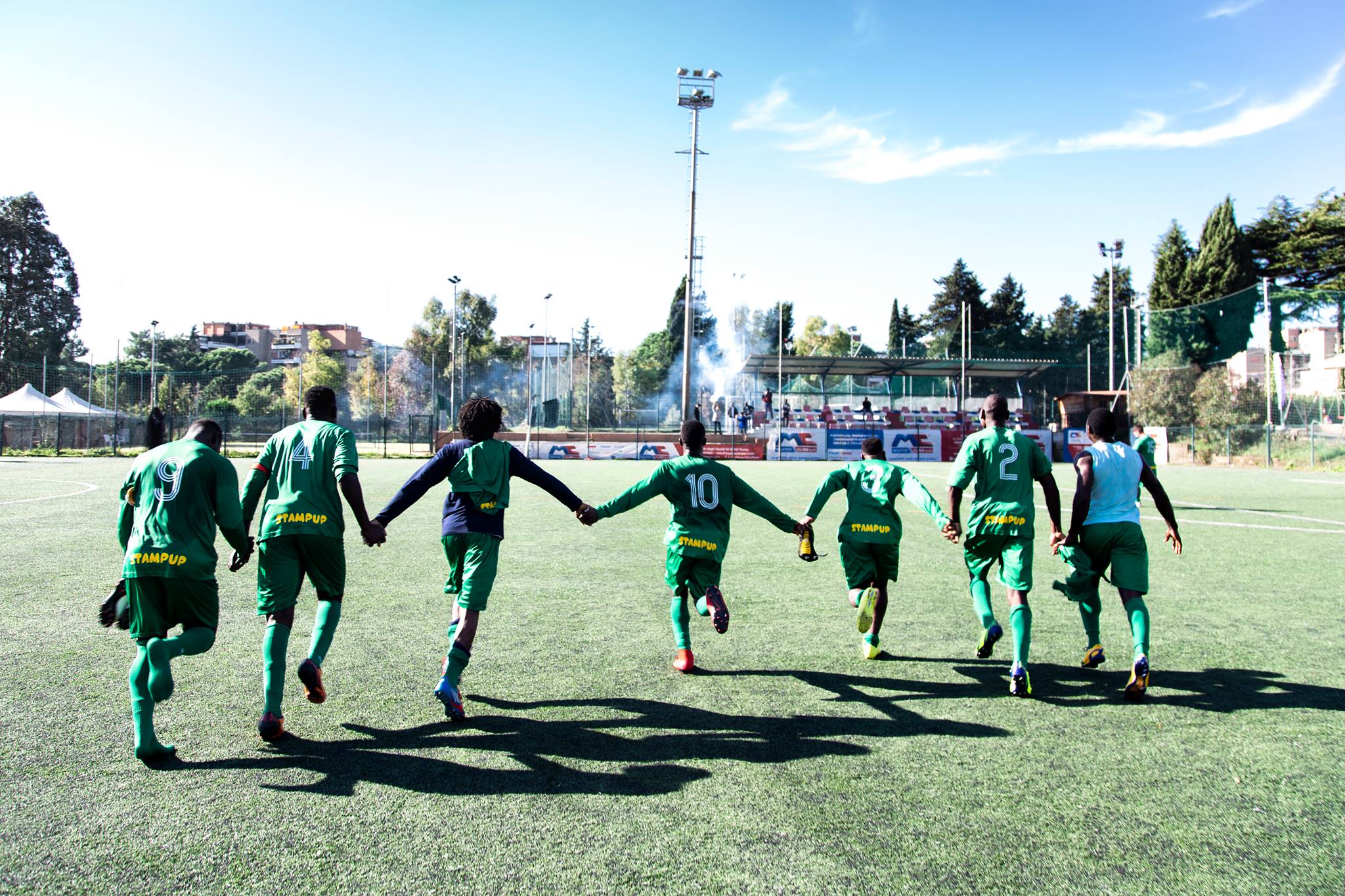 La formazione iniziale era composta da circa 25 ragazzi, ora sono 15 provenienti da Gambia, Mali, Guinea e Costa D’Avorio. Alcuni sono dovuti fuggire, altri sono stati spostati in altri centri dopo la chiusura de “Il Gelsomino”. La frustrazione dovuta alla negazione di un permesso di soggiorno, la nostalgia di casa e della famiglia sono fattori che influenzano la vita dei ragazzi: gli spogliatoi diventano quindi il luogo per sfogarsi ed i compagni di squadra divengono la propria famiglia. Ci si allena duramente e ci si integra progressivamente. Samba è il capitano della squadra, giovane guineano arrivato in Italia da qualche anno dopo aver affrontato un lungo e terribile viaggio attraverso la Libia: ora è impegnato a parlarne nelle scuole, presto sarà redatto anche un libro che raccolga la sua esperienza e di tanti altri giovani migranti. “Noi della squadra siamo una famiglia”, dice sorridente.“I ragazzi si incontrano anche al di là dell’allenamento, escono insieme e sono profondamente legati tra loro. Tentiamo in tutti i modi ed in tutte le forme di includerli e tocchiamo con mano le difficoltà che hanno. Alla maggior parte è stato negato lo status di rifugiato, anche ai ragazzi impegnati nelle scuole e nel servizio civile quindi perfettamente integrati.” aggiunge Lello Melchionda, membro fondatore di Pinacci Nostri. “La rete del Pineto United è una rete nata dal basso e la squadra di calcio diventa il faro di questa rete”