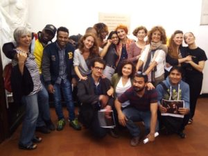 Il gruppo di attori e volontari con la regista Magda Mercatali. photo credit: FB Casa dei Diritti SocialiDai banchi della scuola di via Giolitti al palco del Teatro Belli, passando per la sala prove: l’oratorio del Caravita, nel centro storico di Roma. Una vera avventura, un’esperienza umana importante e preziosa quella degli attori migranti, studenti della scuola di italiano di FOCUS – Casa dei Diritti Sociali che si sono esibiti sul palco dello storico teatro trasteverino lo scorso fine settimana in “Mira la Dindondella…”, per tre serate sold out.Il gruppo di studenti-attori, come ogni anno è stato diretto dalla regista, attrice e insegnante volontaria di CDS Magda Mercatali, che con professionalità e amore accompagna i migranti del laboratorio teatrale in un percorso umano e di formazione: il teatro è magia, emozione, crescita e in questo caso, è stato un vero corso intensivo di italiano. La settima edizione del laboratorio teatrale è stata proprio un omaggio alla lingua italiana, con i calembour, le gag umoristiche, le battute comiche di Achille Campanile.“Mira la Dindondella…”, scritto e diretto da Magda Mercatali, è stata una prova attoriale complessa: giochi di parole, doppi sensi, ritmi serrati, veloci cambi di abiti e oggetti di scena; una vera prova d’attore unita a unasfida linguistica, entrambe superate brillantemente.Abiti di scena neri, da veri attori, firmati dalla costumista teatrale Lia Morandini; scenografia essenziale; a riempire il palco sono state le espressioni comiche, gli sguardi parlanti, le voce sostenuta, i movimenti precisi, la presenza scenica degli attori migranti, accompagnati dalle musiche di Giuliano Taviani.Il laboratorio, che per sei mesi ha impegnato gli attori e il gruppo di volontari di CDS, si è svolto, come ha ricordato la regista, in un periodo difficile, in cui molti studenti della scuola di italiano hanno subito le conseguenze del Decreto Sicurezza, trovandosi tagliati fuori dal sistema di accoglienza. Per questo, il palco è stato molto di più di una casa dell’arte: il laboratorio di teatro è stato per mesi un luogo familiare per questi studenti, perché dietro le quinte sono ancora molte le prove da affrontare.