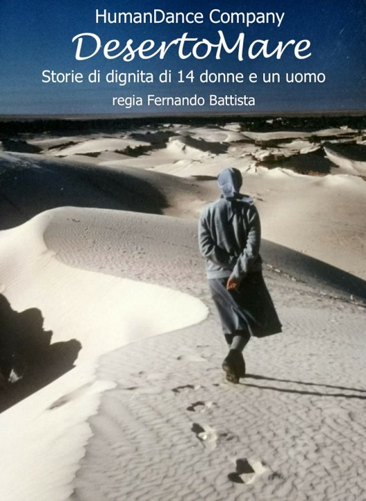 “Quel confine che non divide ma che se lo attraversi ti cambia, ti arricchisce” è l’anima della pedagogia del confine di Fernando Battista. Così con lo stesso spirito a inizio anno è partito un nuovo laboratorio basato su un percorso di inter-codice creativo, “ossia mettendo insieme diversi aspetti della danza, dal Teatro alla Contact, per creare un codice di lettura attraverso il corpo”.Locandina: foto di Vanessa IoannoniLa proposta di partecipare con un contributo alla Manifestazione Inclusiva Stazione Oltremare che si sarebbe tenuta a fine giugno, diventa la spinta e una direzione con scadenza per pensare a un prodotto finale del corso. Da qui l’idea di DesertoMare: storie di dignità di 14 donne e un uomo.Lavorare con la DanzaTerapia e la DanzaTeatro significa integrare un linguaggio che diventa patrimonio condiviso, una relazione empatica che crea un incontro più profondo: insegna la possibilità di potersi esprimere liberamente, al di là di qualsiasi nazionalità o apparente diversità, e produce momenti di integrazione.“La danza appartiene a tutti, quindi tutti possono partecipare: ognuno poi mette in gioco quel che si sente e ha in quel momento. Ad esempio Ousmane, il ragazzo del Senegal protagonista nello spettacolo, quando la sera viene al corso sa che può essere se stesso, sta bene, e alla fine dell’incontro nel momento di restituzione dice sempre qualcosa che ci sorprende, rimette in asse, ci riporta all’essenziale”. Ousmane Demba studia in una scuola alberghiera e lavora instancabilmente in un negozio di stoffe indiane a Piazza Vittorio. La sera appena stacca scappa a Piazza Lodi dove si tengono le lezioni.In DesertoMare alla danza si aggiunge la componente vocale: “abbiamo usato testi autobiografici di donne che hanno frequentato Laboratorio53, ma non solo. Ci sono anche brani tratti da “Lettera a una professoressa” di don Milani e da “Se fosse tuo figlio” di Nicolò Govoni. Maddalena Grechi, che si occupa di teatro sociale, mi ha aiutato nel mettere insieme i testi”.Il titolo viene dalla parte finale del racconto della donna africana che dice “dopo il deserto il mare…” da qui DesertoMare.L’impatto dello spettacolo è stato forte sia sui danzatori, anche quelli che recitavano già da tempo, che sul pubblico: tutti si sono commossi. “Quando agisci sulla parte emotiva è già un feedback positivo”.