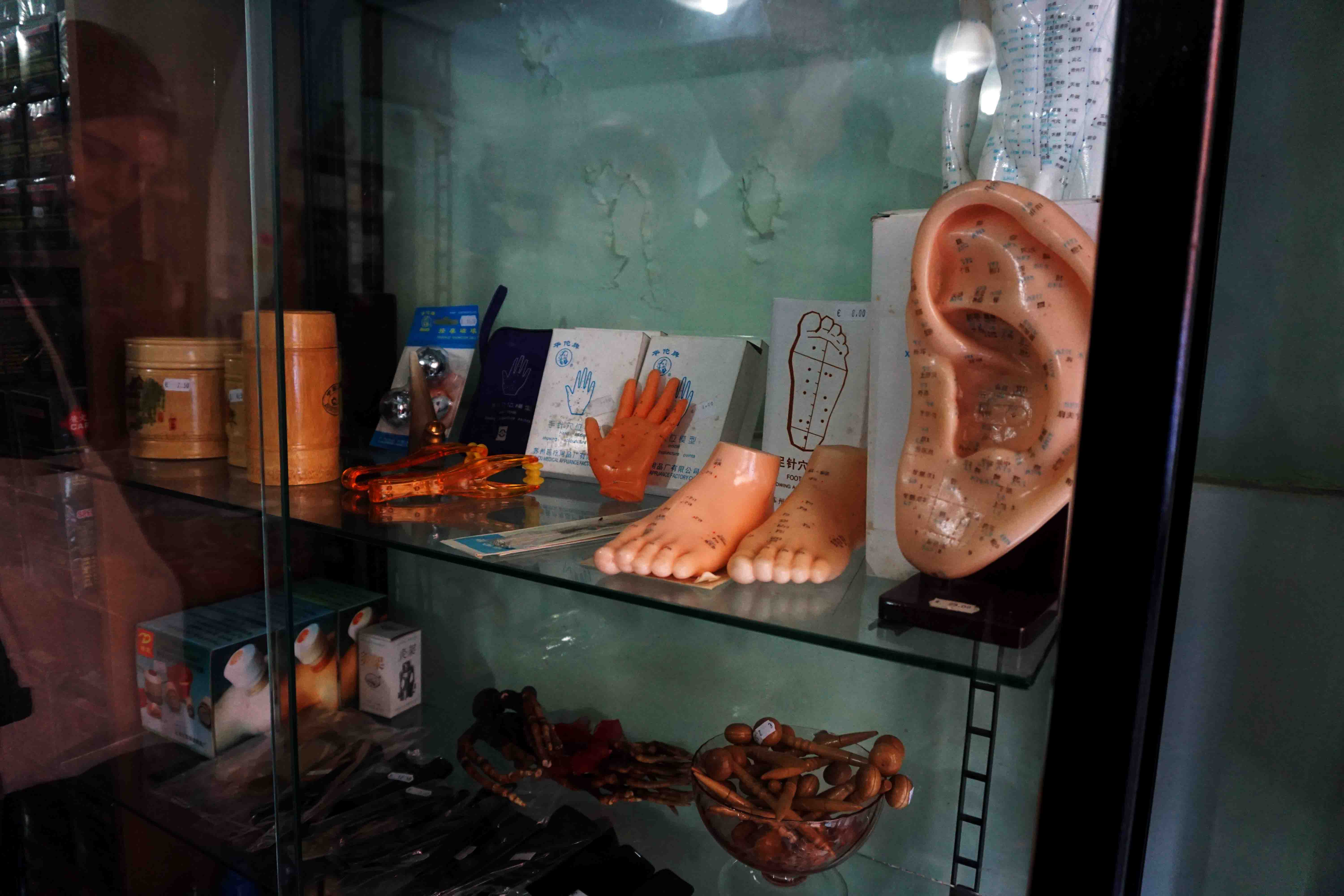 La passeggiata nel quartiere è iniziata dagli storici portici che circondano la piazza, sotto ai quali le attività commerciali cinesi offrono qualsiasi tipo di servizio. La prima tappa è un’erboristeria dalla cui soglia di ingresso è già possibile sentire la fragranza dei molti tè in vendita. Oltre alla grande quantità di prodotti di erboristeria, l’attività offre a clienti e curiosi tutti gli strumenti utili alla pratica della medicina tradizionale cinese. La cura della persona e del corpo è un aspetto fondamentale della cultura asiatica, non a caso la pratica del massaggio è ampiamente promossa ed esercitata.