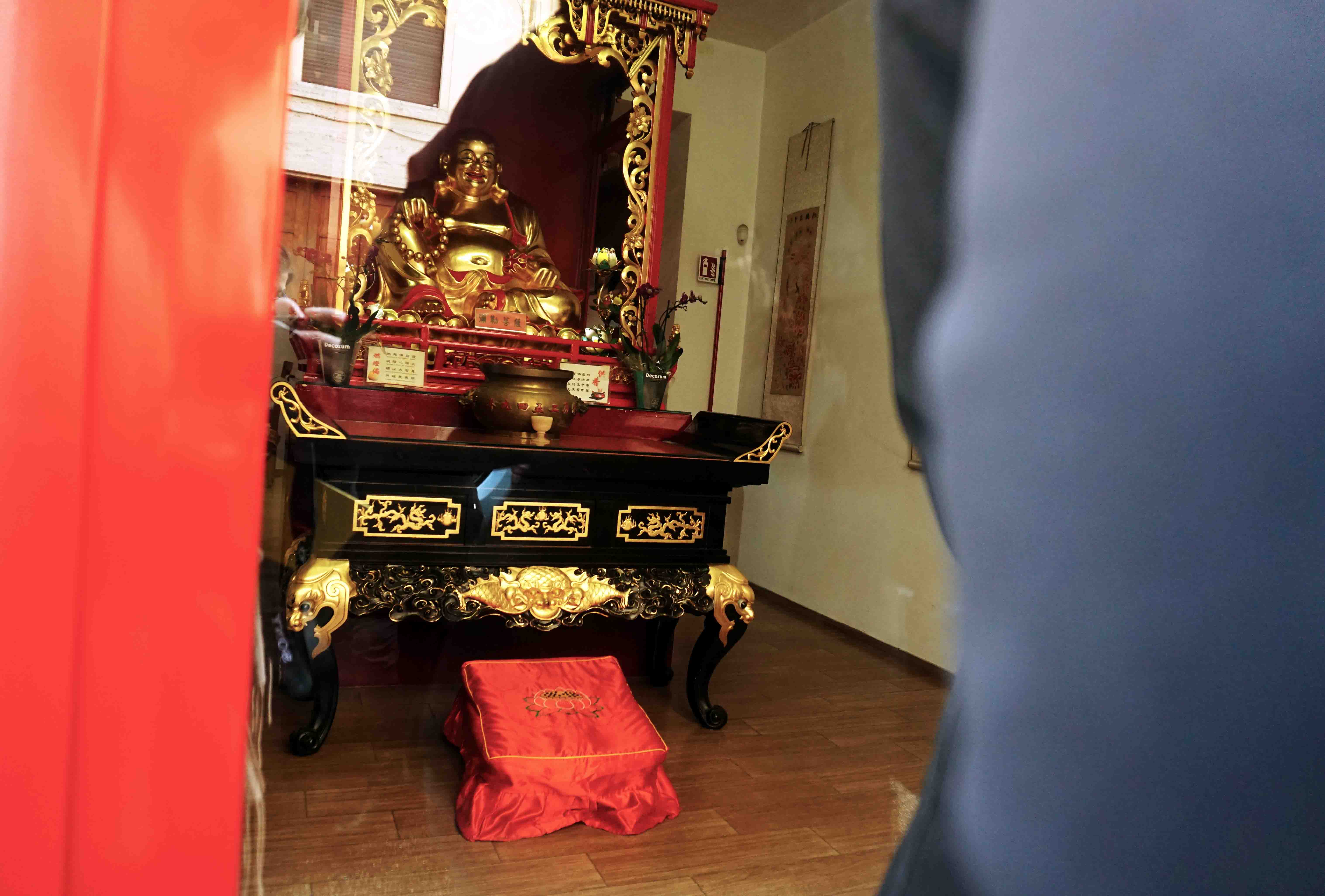 La seconda tappa è al piccolo tempio buddhista cinese, in via Ferruccio, da molti chiamato il tempio del “Buddha nel Garage” perché sorge all’interno di una struttura originariamente pensata come rimessa. Il piccolo tempio, realizzato nel 2005, si differenzia dalle tipiche strutture imponenti tradizionali, ma malgrado ció la comunità cinese locale ne è fortemente legata. Il tempio accoglie i fedeli per le funzioni, tutti i giorni dalle 7:00 alle 19:00, difficilmente è visitabile dai curiosi che sperano di accedervi per scattare qualche foto. Per il piccolo gruppo di Migrantour è stata fatta un’eccezione: l’ingresso del tempio è occupato da una statua d’oro sorridente del Budai, l’incarnazione di Maitreya, ossia del prossimo Buddha, come Bodhisattva. La statua è completamente ricoperta d’oro e adornata da fiori offerti dai fedeli; alle sue spalle vi è la stanza dedicata alle preghiere, a sua volta occupata da statue, fiori, incensi e nastri.
