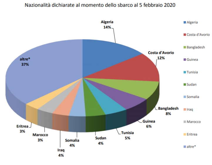 Gli sbarchi in Italia dal 1° gennaio al 5 febbraio 2020 hanno coinvolto 1751 migranti: è il dato che emerge dal Cruscotto statistico, il resoconto periodico del Ministero dell’Interno che consente di monitorare gli arrivi via mare di stranieri in Italia. In cima alla classifica dei paesi di provenienza troviamo: