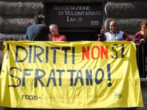 “I diritti non si sfrattano”: le parole che campeggiavano sullo striscione giallo appeso alla balaustra davanti al civico 225 di via Giolitti sono state per quattro anni l’imperativo con cui l’associazione ha portato avanti la sua battaglia per il riconoscimento del valore sociale svolto dall’associazione in difesa delle fasce più svantaggiate della popolazione.