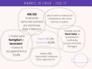 I dati relativi al 2018 permettono di tracciare un quadro più chiaro sulla comunità in Italia. Gli albanesi sono la seconda comunità per presenze dopo il Marocco, con 483.219 soggiornanti; di questi, la maggior parte (60,6%) vive nel Nord Italia, in particolare in Lombardia, a seguire la Toscana e l’Emilia-Romagna. C’è un certo equilibrio tra la presenza maschile e quella femminile (48,8%). Le motivazioni di soggiorno sono perlopiù ricongiungimenti famigliari e motivi lavorativi. Il tasso di occupazione è del 53,8% e le aree di occupazione sono l’edilizia (29%) mentre l’alta percentuale di imprenditori individuali (l’8,5% sugli extra Ue) è indice del fatto che la comunità è riuscita ad inserirsi nel tessuto lavorativo e sociale. I minori non accompagnati albanesi sono tra i più numerosi rispetto alle altre comunità extra Ue (13,5%).
