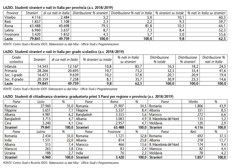Il fenomeno migratorio – secondo i dati raccolti nella XV edizione dell’Osservatorio Romano sulle migrazioni si inserisce in un quadro complessivo di declino demografico:tra il 2014 e il 2019 la popolazione del Lazio è sempre calata, nonostante siano aumentati gli stranieri residenti (+67.003: +10,3%) e quelli che hanno ottenuto la cittadinanza italiana (+48.083). Nel 2018, per la prima volta, l’incremento della popolazione straniera non ha compensato il calo di quella italiana (-21.546 italiani vs +3.935 stranieri) e la regione ha perso 17.611 residenti, non solo per l’elevata mortalità, ma anche per via di una nuova emigrazione.Trent’anni fa il Lazio registrava un’incidenza della popolazione straniera su quella totale del 2,2% e i suoi immigrati (113.706) vivevano per il 76,6% nella Capitale e per il 13,1% nei restanti comuni della sua provincia. In Italia, allora, quasi 1 straniero su 5 risiedeva nel Lazio.