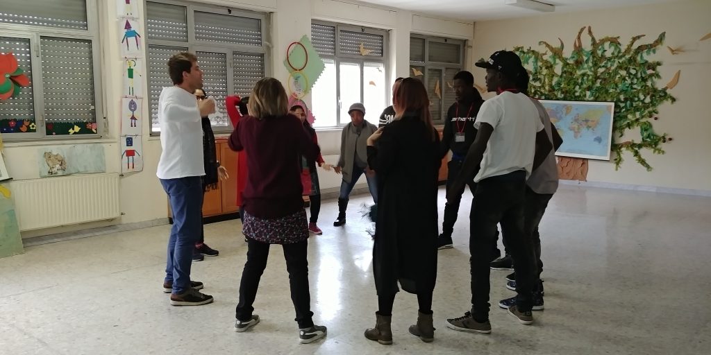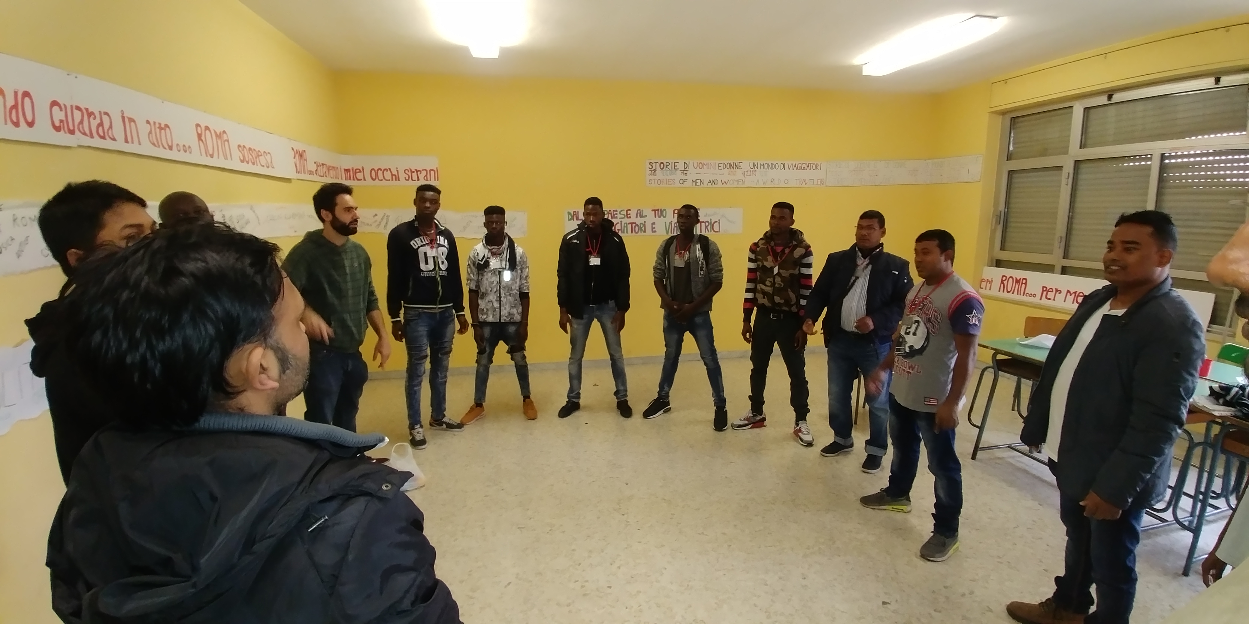 La mattinata comincia con un momento di riscaldamento vocale insieme, prima di dare avvio al vero e proprio laboratorio di canto. A guidarlo Vladimir Douda, responsabile dello stage di teatro e tirocinante presso il Cpia. Vladimir coinvolge gli studenti con attività in cerchio e in coppia per allentare la tensione e allenare le corde vocali.