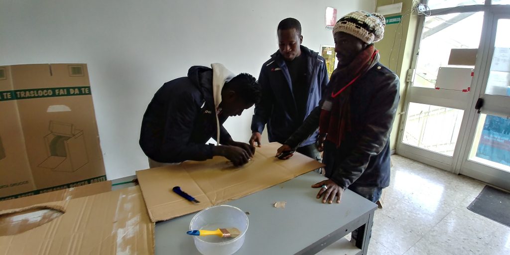 “Mi è piaciuto molto perché ho imparato una tecnica che non conoscevo” dice Karima, studentessa del corso 825 di origine algerina “abbiamo disegnato sul cartone figure astratte, che mi ricordano dei pesci, e abbiamo scritto delle parole nella nostra lingua. Io ho scritto la parola confine, el-hodud, e poi con il taglierino l’abbiamo incisa. Mi piace il laboratorio perché unisce divertimento e studio, scambiamo opinioni e impariamo nuove parole, come ad esempio taglierino”.