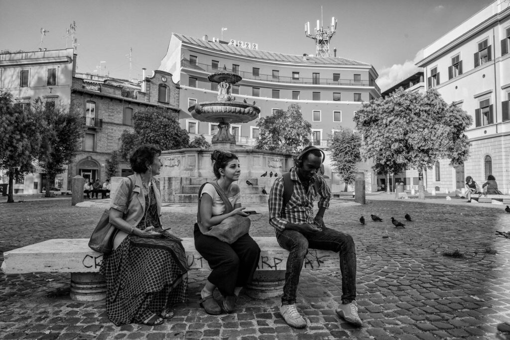 Seduto in piazza Vittorio, poco distante dalla stazione Termini, c’è un ragazzo che arriva da un altro continente. Almeno per un po’ ha trovato il suo posto nella città, ma basta uno sguardo sugli altri, italiani e non, per sentirsi pienamente straniero e far fluire i pensieri dal senso di inadeguatezza del presente alle speranze future, passando per i desideri del passato.