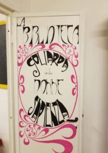 Una volta varcata la splendida porta in stile art nouveau – opera di Claudia, l’artista del collettivo Donne Contro -, il tour tra i libri della Goliarda Sapienza ha finalmente inizio. La prima tappa a partire da sinistra coincide con il settore della narrativa, disposta rigorosamente in ordine alfabetico, seguita dalla sezione dedicata a bambine e ragazze, composta maggiormente da racconti, grafic-novel e testi che trattano di femminismo. Se invece si vuole tentare un’incursione nel mondo della poesia, basta volgere lo sguardo un po’ più a destra, dove campeggia anche la sezione arti, comprendente titoli dedicati al teatro, alla pittura e alle varie arti figurative. A completare il tour, la raccolta di libri in lingua straniera e infine la saggistica, ricca di volumi dedicati al femminismo, alla storia delle donne, ma anche scritti politici e tematiche più ampie come l’immigrazione.