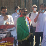 “La manifestazione è organizzata dalla comunità afghana a Roma – afferma Shadam – perché il nostro Paese, l’Afghanistan, è ora sotto il controllo dei talebani, un gruppo terrorista che non cambierà mai le proprie idee. Noi vogliamo che in Afghanistan ci sia la pace. Fra di noi ci sono molti rifugiati, me compreso, che da molti anni vivono in Italia. Da ieri [20 agosto 2021 ndr] lavoro come mediatore a Fiumicino: sono arrivate tantissime famiglie e tanti bambini scappati dall’Afghanistan. Ho lavorato tutta la notte, non ho dormito e stamattina sono venuto direttamente qui per partecipare a questa manifestazione che si rivolge a tutto il popolo afghano, in particolar modo alle donne. Qualche giorno fa sono stato contattato da alcune giornaliste afghane che mi dicevano che la libertà è finita: i talebani non hanno dato loro il permesso di continuare il proprio lavoro impedendogli di entrare negli uffici. Hanno detto che saranno sostituite da uomini”.