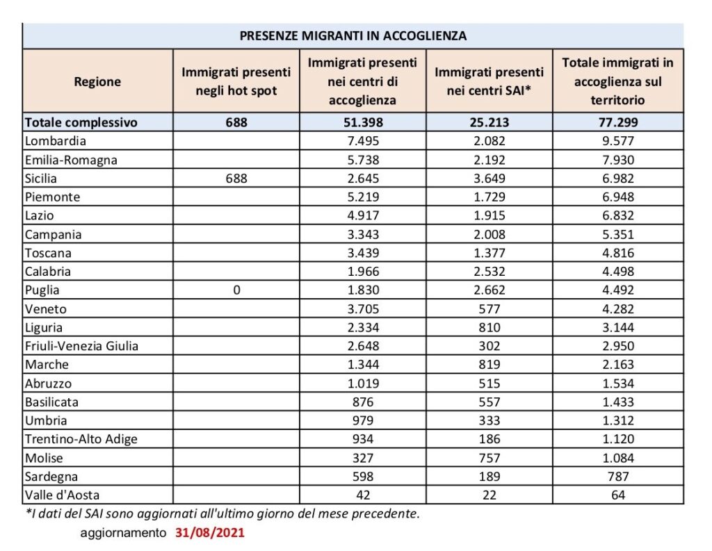 Per quanto riguarda la presenza dei migranti in Italia, secondo gli ultimi dati del Ministero (aggiornati al 31 agosto) su un totale di 77.299 immigrati in accoglienza sul territorio italiano 25.213 sono presenti nei centri SAI (Sistema Accoglienza Integrazione), 51.398 ospitati nei centri di accoglienza e 688 si trovano nell’hotspot di Lampedusa. Come riportato da ISPI, la cifra complessiva di migranti accolti in Italia oggi è molto lontana da quella registrata in passato: nell’ottobre 2017 i migranti accolti furono ben 191.000.