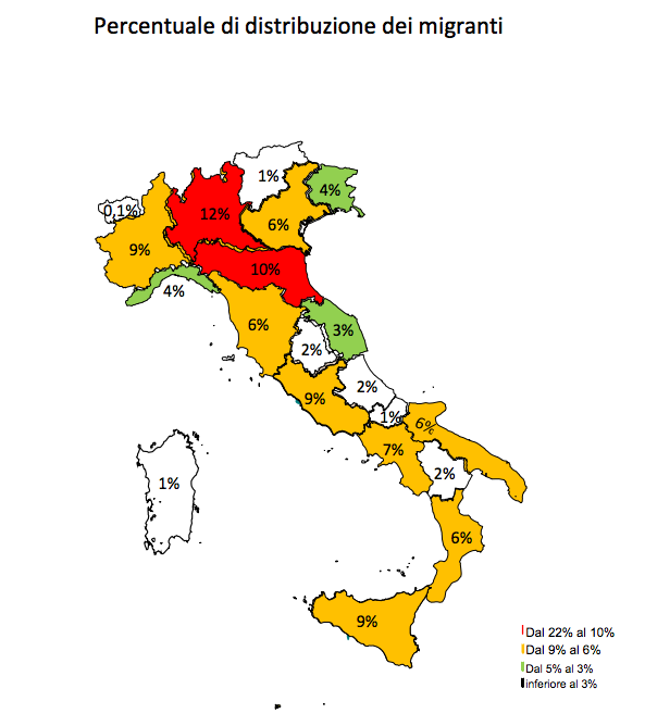 Interessante notare anche la distribuzione dei migranti sul territorio. Se la Sardegna, il Molise e il Trentino Alto-Adige hanno l’1% e la Valle d’Aosta lo 0,1% la maggior parte delle altre regioni italiane si attesta fra il 2 e il 9% con l’eccezione dell’Emilia Romagna (10%) e della Lombardia (12%). Dal 2014 a oggi il numero di stranieri presenti in Italia, compresi gli “irregolari”, è cresciuto solo del 6% (da 5,27 a 5,56 milioni di persone).