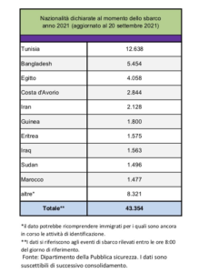 Stando alle nazionalità dichiarate al momento dello sbarco, nel 2021 i Paesi di provenienza vedono il primato della Tunisia con 12.638 migranti, il 29% del totale, seguita dal Bangladesh (5.454 migranti, 13% del totale), dall’Egitto (4.058, 9%), dalla Costa d’Avorio (2.844, 7%) e dall’Iran (2.128, 5%).