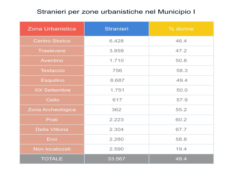 Il Municipio comprende 11 zone urbanistiche a seguito dell’accorpamento dei precedenti Roma I e Roma XVII, operato dall’Assemblea capitolina nel marzo 2013: Centro storico, Trastevere, Aventino, Testaccio, Esquilino, XX Settembre, Celio, Zona Archeologica, Prati, Della Vittoria, Eroi; all’interno delle quali la popolazione straniera si distribuisce con una prevalenza nei quartieri Esquilino e Centro Storico.