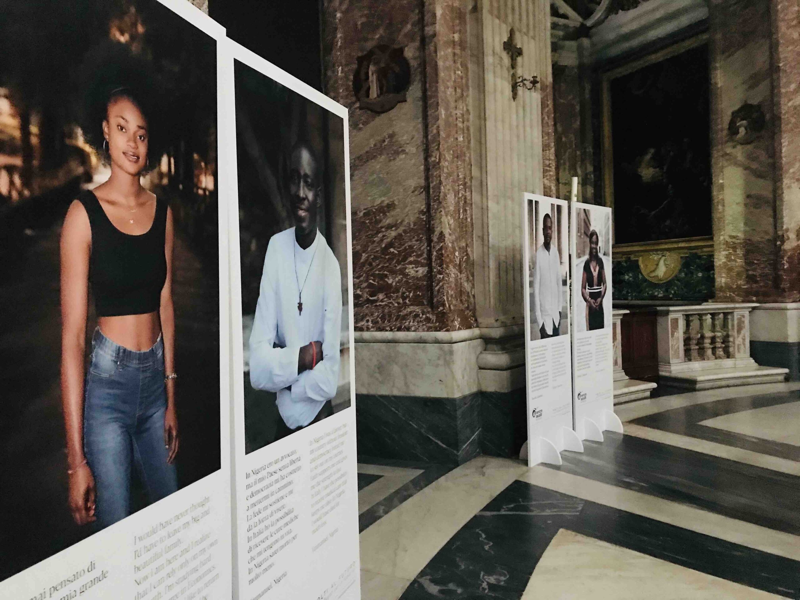 Le fotografie esposte sono state stampate a grandezza umana per far sì che gli sguardi dei soggetti siano volti a chi li osserva, ed è forse questo che rende speciale il loro valore narrativo: “è una mostra di sguardi rivolti al passato, al presente ma soprattutto al futuro”, secondo il fotografo. I volti dei soggetti sono sorridenti e rassicuranti, non trapela l’ombra di emozioni negative. Ma quanto raccontano le fotografie e quanto deve essere interpretato dall’osservatore? Secondo Malavolta non c’è dubbio: “in questi ritratti quello che non si vede è il dolore di chi è andato via, di chi ha dovuto lasciare la propria famiglia. Il dolore lo puoi carpire solo dalle brevi descrizioni sotto alle fotografie”. Ed è forse questo che può essere ritrovato nella mostra che celebra i quarant’anni del Centro Astalli e che caratterizza i tanti anni di attività: passato, presente ma soprattutto futuro.