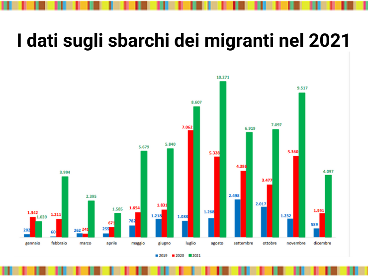 Tranne che a gennaio, i dati sugli sbarchi in Italia risultano in tutti i mesi del 2021 di gran lunga superiori al 2020 e al 2019. Con 10.271 persone arrivate sulle coste dal Mediterraneo, agosto è il mese record. Mentre a dicembre la cifra è arrivata a 4.097 contro i 1.597 del 2020 e i 589 del 2019.