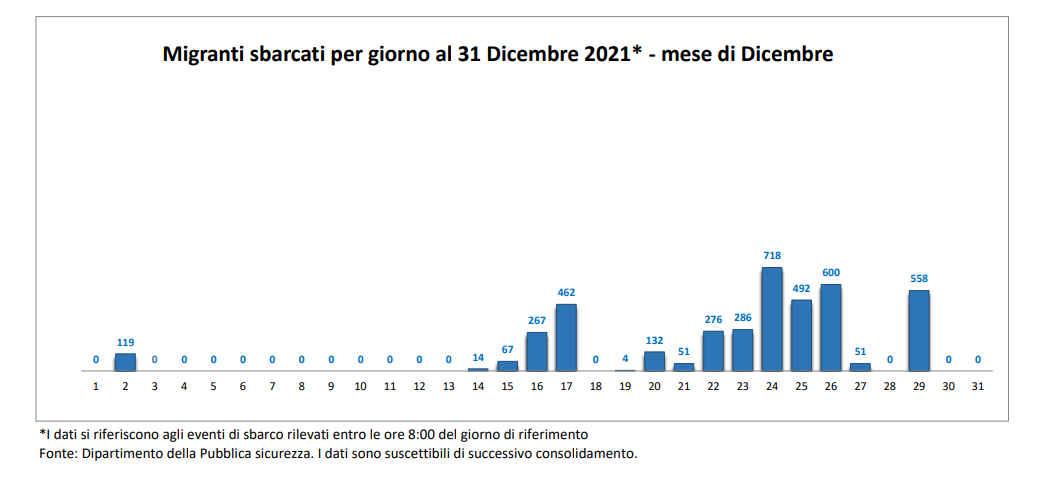 A prescindere dall’età dei migranti, il picco dell’ultimo mese dell’anno si è avuto il 24 dicembre: 718 donne, uomini, bambine, bambini, ragazze, ragazzi sono entrati in Europa via mare in 24 ore.