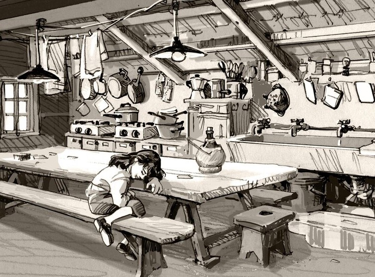 Una bambina sola addormentata con la testa sul tavolo della cucina