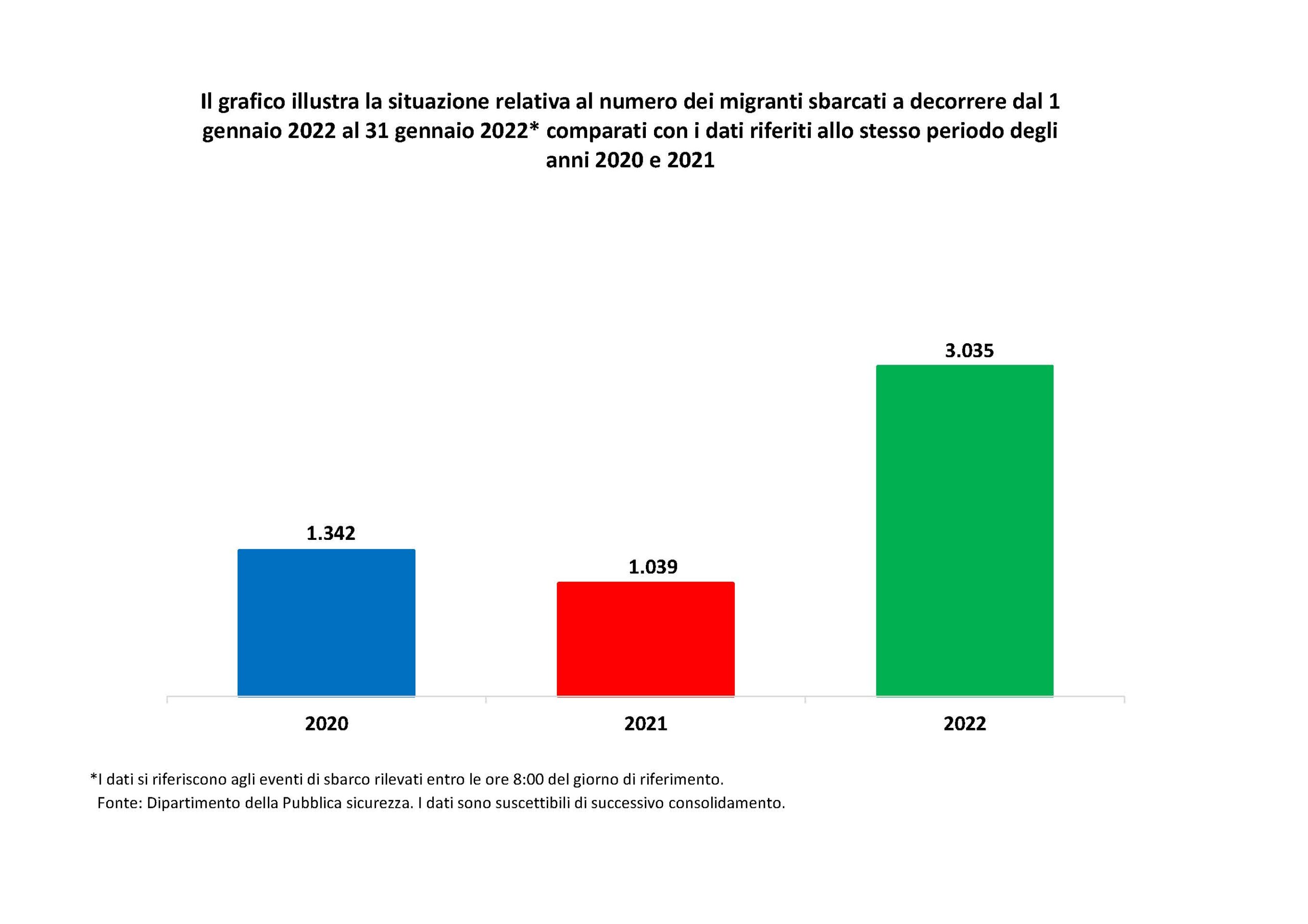 Non si arrestano gli arrivi via mare anche nel nuovo anno. Secondo i dati sugli sbarchi forniti dal Ministero dell’Interno sono 3.305 i migranti sbarcati nel primo mese del 2022. Quasi il triplo rispetto a gennaio 2021, quando i migranti arrivati via mare sono stati 1.039, e anche rispetto a gennaio 2020, che vide 1.342 sbarcati.