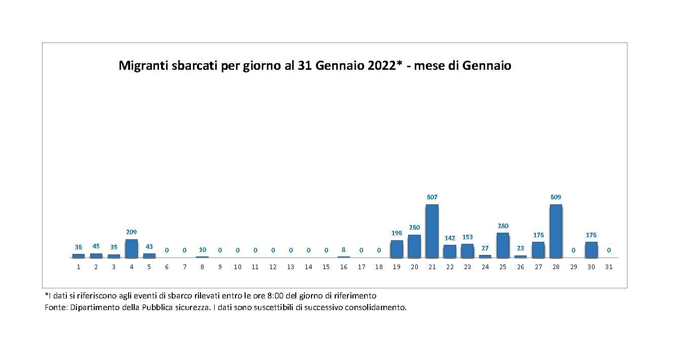 Il documento del Ministero indica come giorni più “caldi” nel primo mese del 2022 il 21 gennaio con 607 arrivi via mare e il 28 con 609, giorno in cui 439 migranti sono sbarcati al porto di Augusta dalla Geo Barents, la nave di Medici senza Frontiere. Anche la nave Aita Mari, della ONG Salvamento Marítimo, dopo aver fatto richiesta all’Italia di un porto sicuro ha potuto far scendere il 30 gennaio a Lampedusa i 176 migranti precedentemente salvati in due operazioni di soccorso.