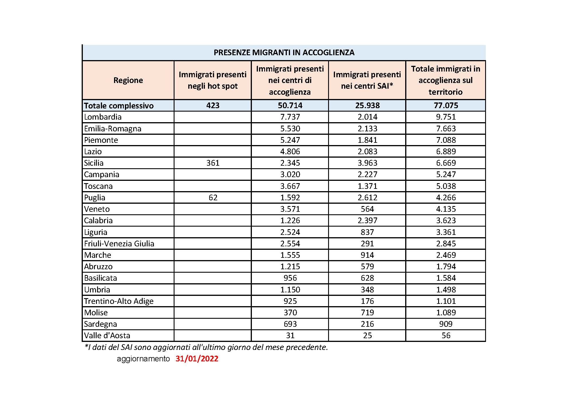 Confrontando i dati sull’accoglienza con quelli di fine 2021 notiamo come il totale di immigrati presenti sul territorio sia diminuito, passando da 78.421 (dati 15 dicembre 2021) a 77.075. Il numero di migranti nei centri SAI è invece rimasto quasi invariato, passando da 25.715 di fine 2021 a 25.938 di inizio 2022. I migranti negli hot spot sono aumentati di poco, da 398 a 423: a dicembre 2021 quelli presenti in Sicilia erano 179 rispetto agli attuali 361, mentre i migranti presenti negli hot spot pugliesi erano 219 a fine 2021 e 62 a gennaio 2022.